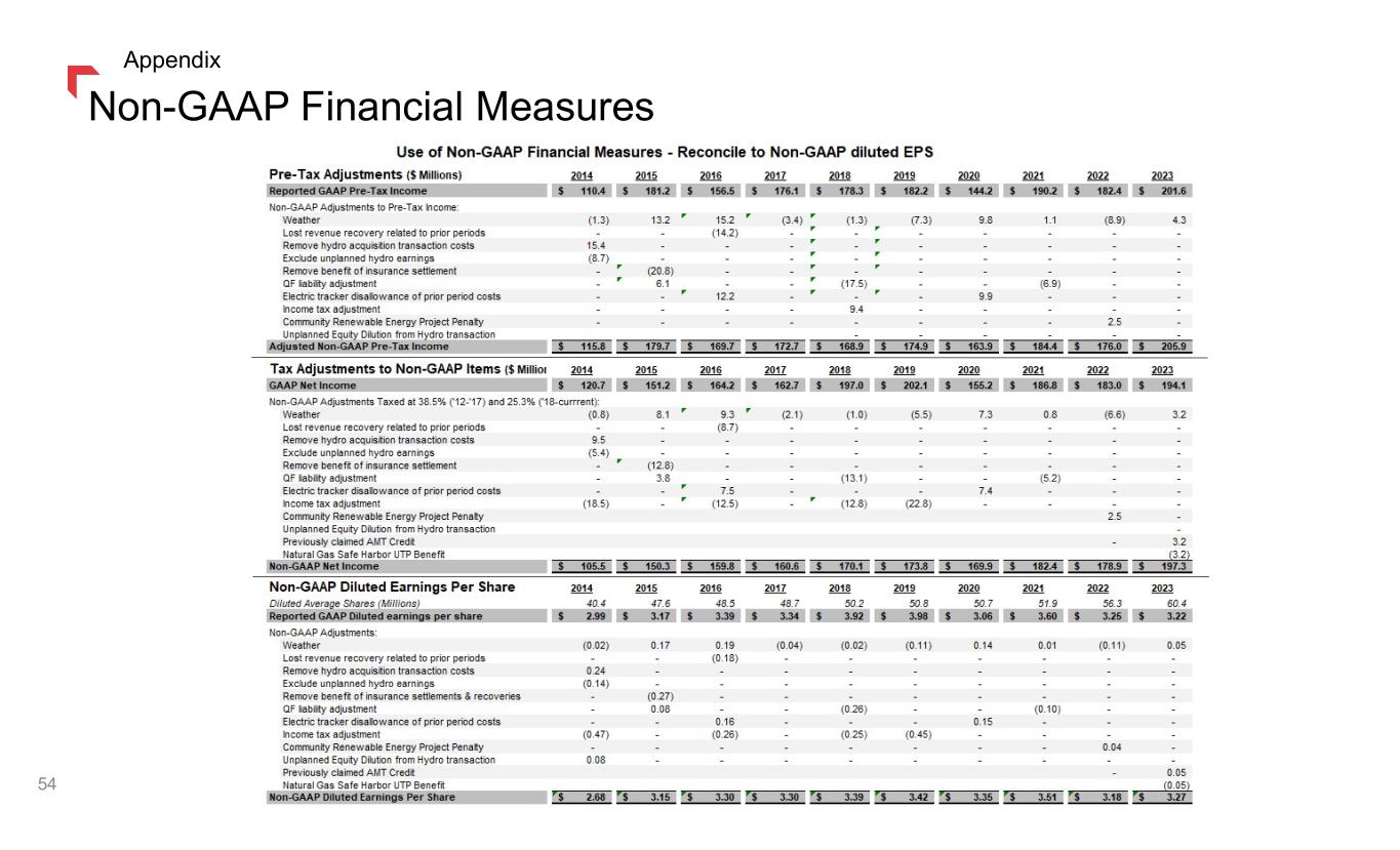Non-GAAP Financial Measures This presentation includes financial information prepared in accordance with GAAP, as well as other financial measures, such as Utility Margin, Adjusted Non-GAAP pretax income, Adjusted Non-GAAP net income and Adjusted Non-GAAP Diluted EPS that are considered “non-GAAP financial measures.” Generally, a non-GAAP financial measure is a numerical measure of a company’s financial performance, financial position or cash flows that excludes (or includes) amounts that are included in (or excluded from) the most directly comparable measure calculated and presented in accordance with GAAP. We define Utility Margin as Operating Revenues less fuel, purchased supply and direct transmission expense (exclusive of depreciation and depletion) as presented in our Consolidated Statements of Income. This measure differs from the GAAP definition of Gross Margin due to the exclusion of Operating and maintenance, Property and other taxes, and Depreciation and depletion expenses, which are presented separately in our Consolidated Statements of Income. A reconciliation of Utility Margin to Gross Margin, the most directly comparable GAAP measure, is included in this presentation. Management believes that Utility Margin provides a useful measure for investors and other financial statement users to analyze our financial performance in that it excludes the effect on total revenues caused by volatility in energy costs and associated regulatory mechanisms. This information is intended to enhance an investor's overall understanding of results. Under our various state regulatory mechanisms, as detailed below, our supply costs are generally collected from customers. In addition, Utility Margin is used by us to determine whether we are collecting the appropriate amount of energy costs from customers to allow recovery of operating costs, as well as to analyze how changes in loads (due to weather, economic or other conditions), rates and other factors impact our results of operations. Our Utility Margin measure may not be comparable to that of other companies' presentations or more useful than the GAAP information provided elsewhere in this report. Management also believes the presentation of Adjusted Non-GAAP pre-tax income, Adjusted Non-GAAP net income and Adjusted Non-GAAP Diluted EPS is more representative of normal earnings than GAAP pre-tax income, net income and EPS due to the exclusion (or inclusion) of certain impacts that are not reflective of ongoing earnings. The presentation of these non-GAAP measures is intended to supplement investors' understanding of our financial performance and not to replace other GAAP measures as an indicator of actual operating performance. Our measures may not be comparable to other companies' similarly titled measures. 55 Appendix