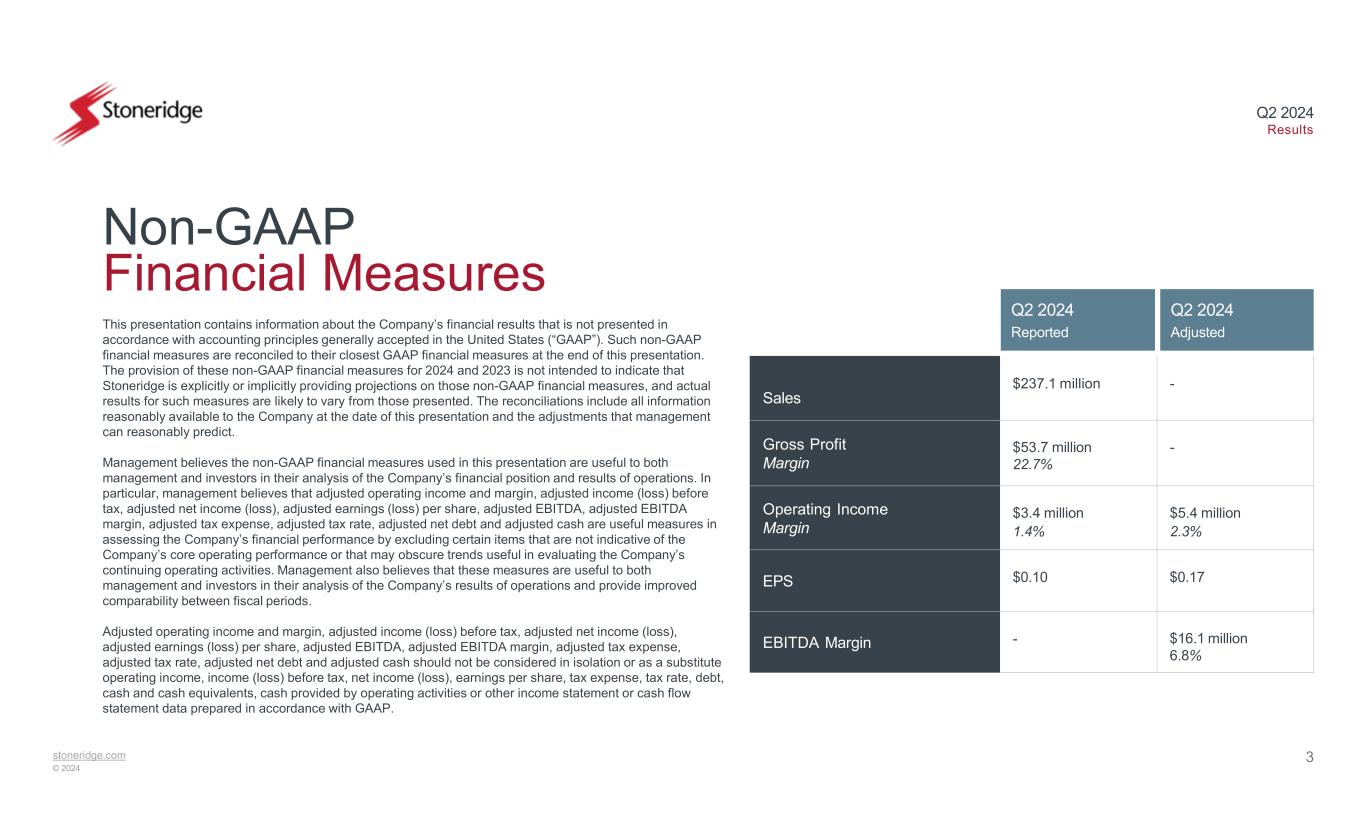 stoneridge.com © 2024 Q2 2024 Results 2 Forward-Looking Statements Statements in this presentation that are not historical facts are forward-looking statements, which involve risks and uncertainties that could cause actual events or results to differ materially from those expressed or implied by the statements. Important factors that may cause actual results to differ materially from those in the forward-looking statements include, among other factors, the ability of our suppliers to supply us parts and components at competitive prices on a timely basis, including the impact of potential tariffs and trade considerations on their operations and output; fluctuations in the cost and availability of key materials (including semiconductors, printed circuit boards, resin, aluminum, steel and copper) and components and our ability to offset cost increases through negotiated price increases with our customers or other cost actions, as necessary; global economic trends, competition and geopolitical risks, including impacts from ongoing or potential conflicts and any related sanctions and other measures, or an escalation of sanctions, tariffs or other trade tensions between the U.S. and other countries; our ability to achieve cost reductions that offset or exceed customer-mandated selling price reductions; the reduced purchases, loss or bankruptcy of a major customer or supplier; the costs and timing of business realignment, facility closures or similar actions; a significant change in automotive, commercial, off-highway or agricultural vehicle production; competitive market conditions and resulting effects on sales and pricing; foreign currency fluctuations and our ability to manage those impacts; customer acceptance of new products; our ability to successfully launch/produce products for awarded business; adverse changes in laws, government regulations or market conditions, affecting our products, our suppliers, or our customers’ products; labor disruptions at Stoneridge’s facilities or at any of Stoneridge significant customers or suppliers; the amount of Stoneridge’s indebtedness and the restrictive covenants contained in the agreements governing its indebtedness, including its revolving Credit Facility; capital availability or costs, including changes in interest rates; the occurrence or non-occurrence of circumstances beyond Stoneridge’s control; and the items described in “Risk Factors” and other uncertainties or risks discussed in Stoneridge’s periodic and current reports filed with the Securities and Exchange Commission. Important factors that could cause the performance of the commercial vehicle and automotive industry to differ materially from those in the forward-looking statements include factors such as (1) continued economic instability or poor economic conditions in the United States and global markets, (2) changes in economic conditions, housing prices, foreign currency exchange rates, commodity prices, including shortages of and increases or volatility in the price of oil, (3) changes in laws and regulations, (4) the state of the credit markets, (5) political stability, (6) international conflicts and (7) the occurrence of force majeure events. These factors should not be construed as exhaustive and should be considered with the other cautionary statements in Stoneridge’s filings with the Securities and Exchange Commission. Forward-looking statements are not guarantees of future performance; Stoneridge’s actual results of operations, financial condition and liquidity, and the development of the industry in which Stoneridge operates may differ materially from those described in or suggested by the forward-looking statements contained in this presentation. In addition, even if Stoneridge’s results of operations, financial condition and liquidity, and the development of the industry in which Stoneridge operates are consistent with the forward-looking statements contained in this presentation, those results or developments may not be indicative of results or developments in subsequent periods. This presentation contains time-sensitive information that reflects management’s best analysis only as of the date of this presentation. Any forward-looking statements in this presentation speak only as of the date of this presentation, and Stoneridge undertakes no obligation to update such statements. Comparisons of results for current and any prior periods are not intended to express any future trends or indications of future performance, unless expressed as such, and should only be viewed as historical data Stoneridge does not undertake any obligation to publicly update or revise any forward-looking statement as a result of new information, future events or otherwise, except as otherwise required by law. Rounding Disclosure: There may be slight immaterial differences between figures represented in our public filings compared to what is shown in this presentation. The differences are the result of rounding due to the representation of values in millions rather than thousands in public filings.