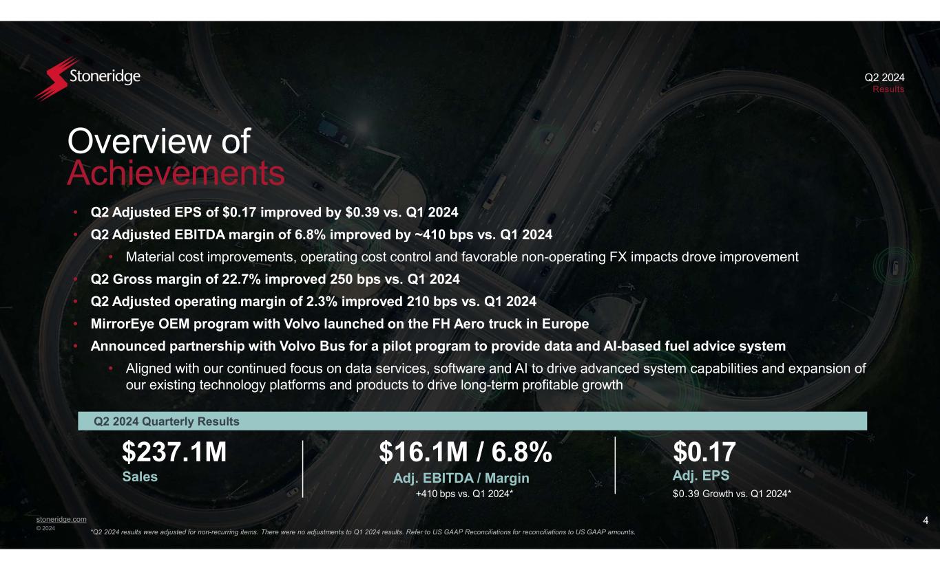 stoneridge.com © 2024 Q2 2024 Results 3 Non-GAAP Financial Measures This presentation contains information about the Company’s financial results that is not presented in accordance with accounting principles generally accepted in the United States (“GAAP”). Such non-GAAP financial measures are reconciled to their closest GAAP financial measures at the end of this presentation. The provision of these non-GAAP financial measures for 2024 and 2023 is not intended to indicate that Stoneridge is explicitly or implicitly providing projections on those non-GAAP financial measures, and actual results for such measures are likely to vary from those presented. The reconciliations include all information reasonably available to the Company at the date of this presentation and the adjustments that management can reasonably predict. Management believes the non-GAAP financial measures used in this presentation are useful to both management and investors in their analysis of the Company’s financial position and results of operations. In particular, management believes that adjusted operating income and margin, adjusted income (loss) before tax, adjusted net income (loss), adjusted earnings (loss) per share, adjusted EBITDA, adjusted EBITDA margin, adjusted tax expense, adjusted tax rate, adjusted net debt and adjusted cash are useful measures in assessing the Company’s financial performance by excluding certain items that are not indicative of the Company’s core operating performance or that may obscure trends useful in evaluating the Company’s continuing operating activities. Management also believes that these measures are useful to both management and investors in their analysis of the Company’s results of operations and provide improved comparability between fiscal periods. Adjusted operating income and margin, adjusted income (loss) before tax, adjusted net income (loss), adjusted earnings (loss) per share, adjusted EBITDA, adjusted EBITDA margin, adjusted tax expense, adjusted tax rate, adjusted net debt and adjusted cash should not be considered in isolation or as a substitute operating income, income (loss) before tax, net income (loss), earnings per share, tax expense, tax rate, debt, cash and cash equivalents, cash provided by operating activities or other income statement or cash flow statement data prepared in accordance with GAAP. Q2 2024 Reported Q2 2024 Adjusted -$237.1 million Sales -$53.7 million 22.7% Gross Profit Margin $5.4 million 2.3% $3.4 million 1.4% Operating Income Margin $0.17$0.10EPS $16.1 million 6.8% -EBITDA Margin