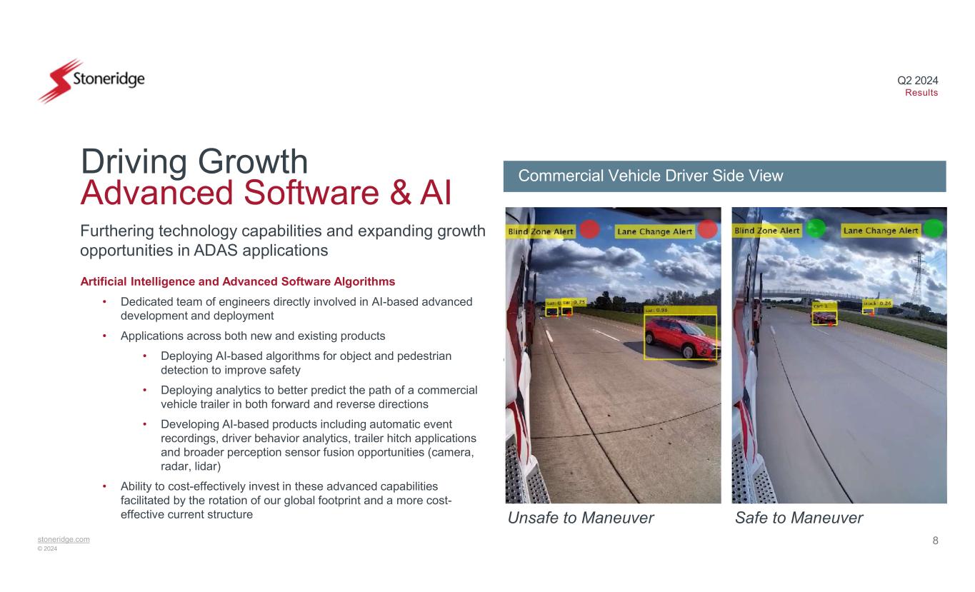 stoneridge.com © 2024 Q2 2024 Results MirrorEye CMS Updates • Launched on Volvo’s FH Aero Model in Europe in Q2 2024 • 2024 OEM orders have shown some volatility as program and truck production continue to ramp up • Exceptional initial customer feedback • We expect take rates to at least remain consistent with previous forecasts once the program ramps up (~45%) • Peterbilt program launched on Models 579 and 567 in North America in July • Peterbilt has heavily marketed the system emphasizing its core features, including maximizing driver visibility and safety Commercial Updates Digital Services Updates Volvo Bus Partnership • Offering Stoneridge’s data and artificial intelligence fuel advice solution to Volvo Buses’ customers in selected markets in pilot program during 2024 • Solution utilizes vehicle generated data and applies artificial intelligence (AI) to proactively support operators to reduce fuel consumption • Partnership enables efficient and sustainable mobility 7