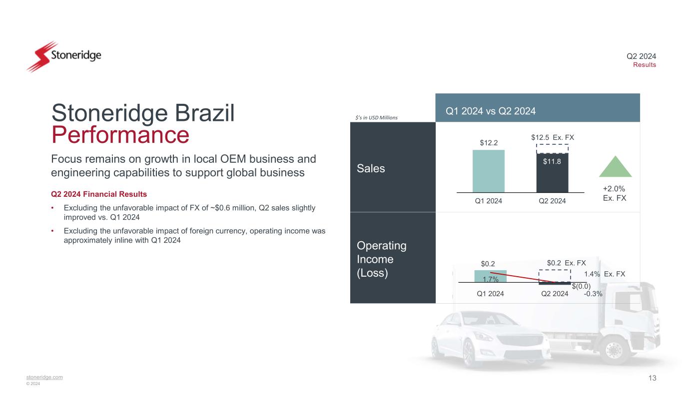 12stoneridge.com © 2024 Q2 2024 Results Sales Adj. Operating Income* Q1 2024 vs Q2 2024 $’s in USD Millions Significant and continued margin expansion in Q2 Electronics Performance Q2 2024 Financial Results • Excluding the unfavorable impact of foreign currency of ~$2.2 million, Q2 sales were approximately in-line with Q1 2024 • Lower European commercial vehicle sales were offset by higher sales in the European off-highway and North American commercial vehicle end markets • Q2 operating margin expansion of ~310 bps vs. Q1 2024 primarily due to material cost improvement, lower quality-related costs and lower engineering expenses +310 bps $156.1 $153.5 Q1 2024 Q2 2024 $155.7 Ex. FX $7.1 $11.7 4.5% 7.6% Q1 2024 Q2 2024 Note: FX impact to adj operating income rounded to $0.0 million. *Q2 2024 results were adjusted for non-recurring items. There were no adjustments made to Q1 2024 reported results. Refer to US GAAP Reconciliations for reconciliations to US GAAP amounts.