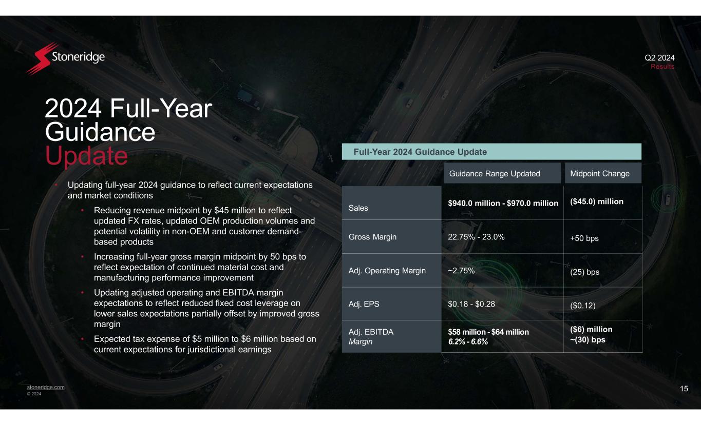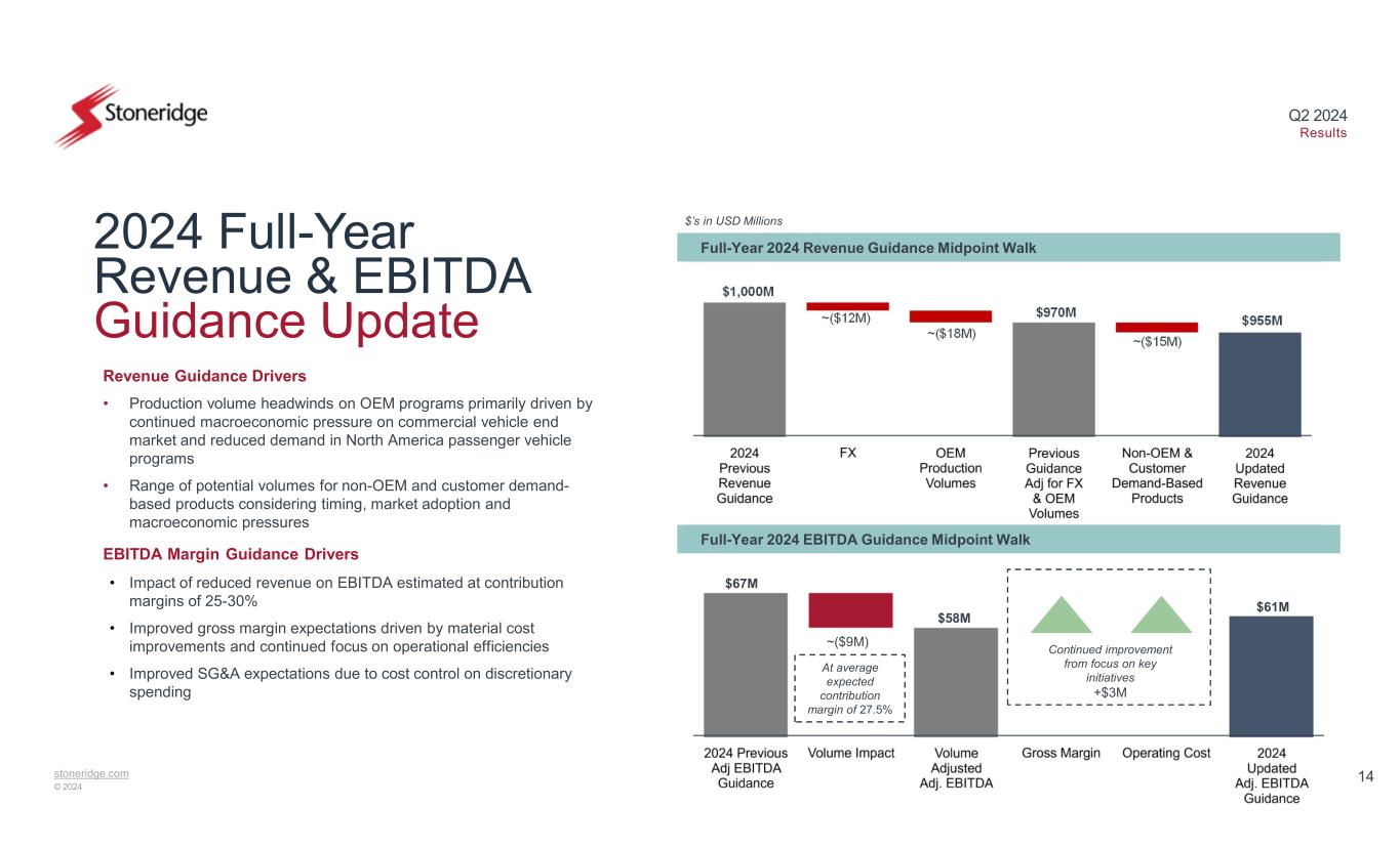stoneridge.com © 2024 Q2 2024 Results 2024 Full-Year Revenue & EBITDA Guidance Update Revenue Guidance Drivers • Production volume headwinds on OEM programs primarily driven by continued macroeconomic pressure on commercial vehicle end market and reduced demand in North America passenger vehicle programs • Range of potential volumes for non-OEM and customer demand- based products considering timing, market adoption and macroeconomic pressures EBITDA Margin Guidance Drivers • Impact of reduced revenue on EBITDA estimated at contribution margins of 25-30% • Improved gross margin expectations driven by material cost improvements and continued focus on operational efficiencies • Improved SG&A expectations due to cost control on discretionary spending $61M $67M ~($9M) $’s in USD Millions $955M $1,000M ~($12M) ~($18M) Full-Year 2024 Revenue Guidance Midpoint Walk Full-Year 2024 EBITDA Guidance Midpoint Walk $970M $58M Continued improvement from focus on key initiatives +$3M At average expected contribution margin of 27.5% ~($15M) 14