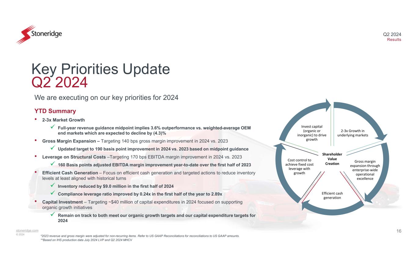 16stoneridge.com © 2024 Q2 2024 Results Key Priorities Update Q2 2024 YTD Summary • 2-3x Market Growth Full-year revenue guidance midpoint implies 3.6% outperformance vs. weighted-average OEM end markets which are expected to decline by (4.3)% • Gross Margin Expansion – Targeting 140 bps gross margin improvement in 2024 vs. 2023 Updated target to 190 basis point improvement in 2024 vs. 2023 based on midpoint guidance • Leverage on Structural Costs –Targeting 170 bps EBITDA margin improvement in 2024 vs. 2023 160 Basis points adjusted EBITDA margin improvement year-to-date over the first half of 2023 • Efficient Cash Generation – Focus on efficient cash generation and targeted actions to reduce inventory levels at least aligned with historical turns Inventory reduced by $9.0 million in the first half of 2024 Compliance leverage ratio improved by 0.24x in the first half of the year to 2.89x • Capital Investment – Targeting ~$40 million of capital expenditures in 2024 focused on supporting organic growth initiatives Remain on track to both meet our organic growth targets and our capital expenditure targets for 2024 We are executing on our key priorities for 2024 **Based on IHS production data July 2024 LVP and Q2 2024 MHCV 2-3x Growth in underlying markets Gross margin expansion through enterprise-wide operational excellence Efficient cash generation Cost control to achieve fixed cost leverage with growth Invest capital (organic or inorganic) to drive growth Shareholder Value Creation *2023 revenue and gross margin were adjusted for non-recurring items. Refer to US GAAP Reconciliations for reconciliations to US GAAP amounts.