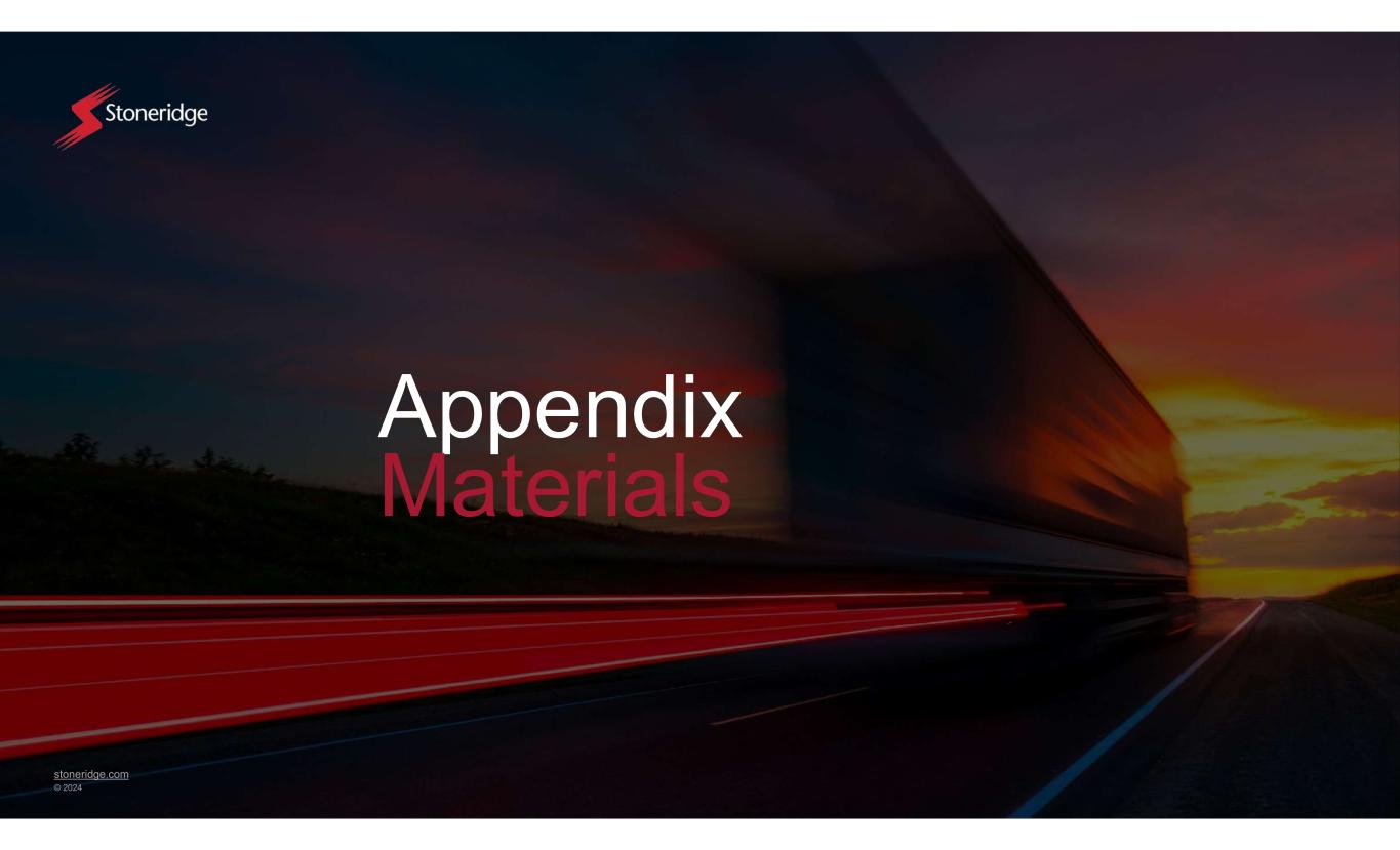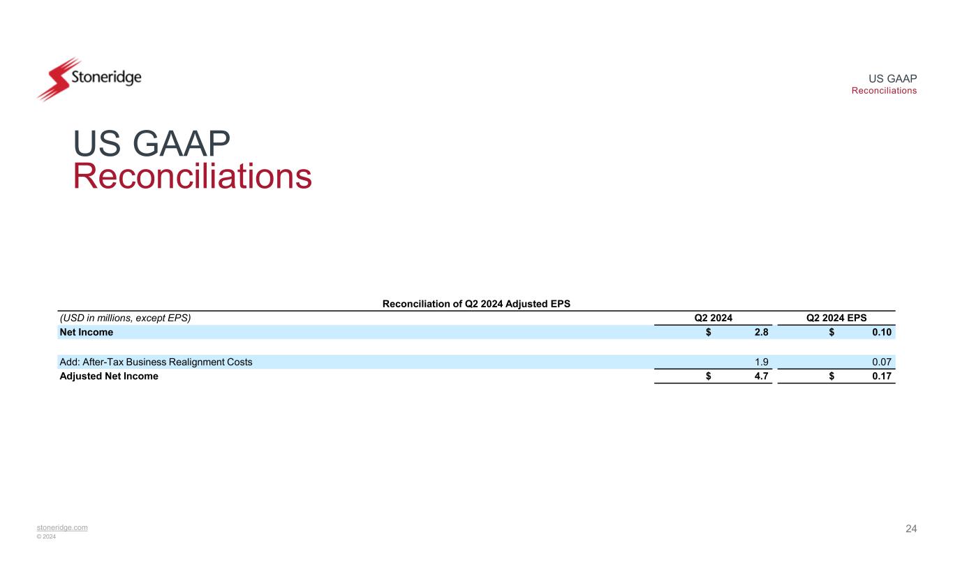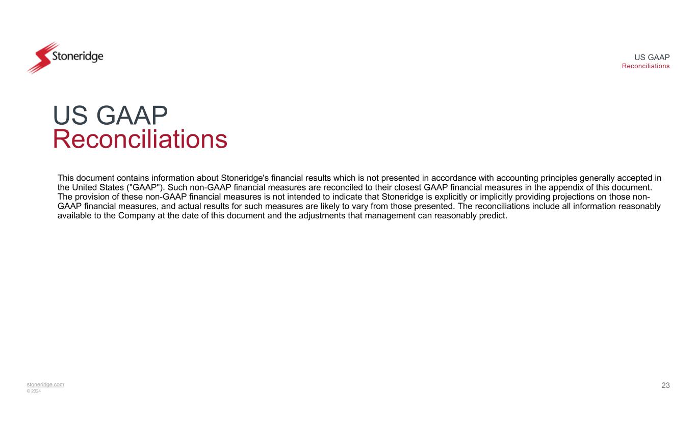 stoneridge.com © 2024 US GAAP Reconciliations US GAAP Reconciliations 23 This document contains information about Stoneridge's financial results which is not presented in accordance with accounting principles generally accepted in the United States ("GAAP"). Such non-GAAP financial measures are reconciled to their closest GAAP financial measures in the appendix of this document. The provision of these non-GAAP financial measures is not intended to indicate that Stoneridge is explicitly or implicitly providing projections on those non- GAAP financial measures, and actual results for such measures are likely to vary from those presented. The reconciliations include all information reasonably available to the Company at the date of this document and the adjustments that management can reasonably predict.