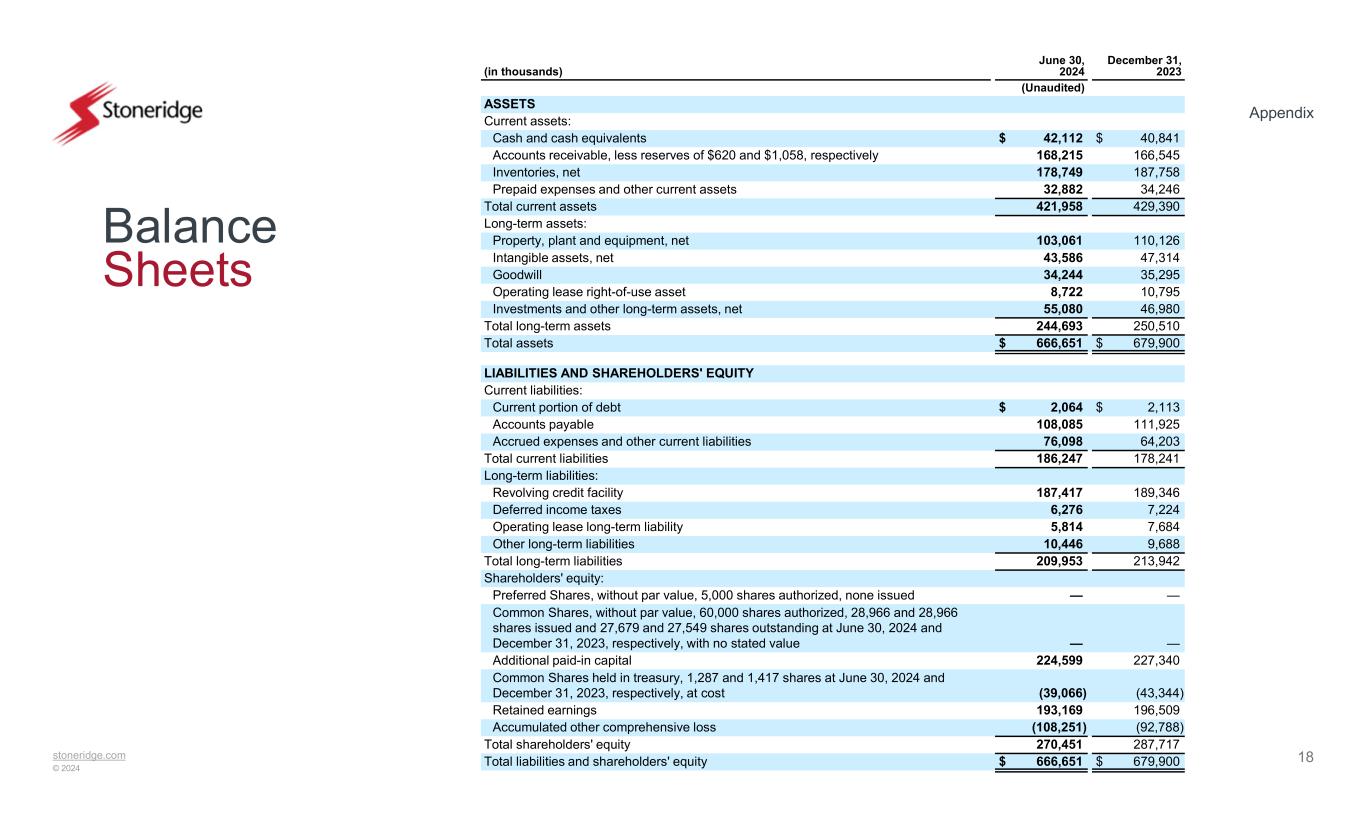 stoneridge.com © 2024 Appendix 19 Income Statement Six months ended June 30, Three months ended June 30, 2023202420232024(in thousands, except per share data) $ 508,139$ 476,216$ 266,814$ 237,059Net sales Costs and expenses: 404,849374,119206,326183,319Cost of goods sold 63,35462,29933,49131,876Selling, general and administrative 39,63436,06022,66618,457Design and development 3023,7384,3313,407Operating income 5,8667,4353,1203,801Interest expense, net 50032932952Equity in loss of investee 3,535(260)2,387(2,296)Other (income) expense, net (9,599)(3,766)(1,505)1,850Income (loss) before income taxes 779(426)1,487(936)(Benefit) provision for income taxes $ (10,378)$ (3,340)$ (2,992)$ 2,786Net income (loss) Income (loss) per share: $ (0.38)$ (0.12)$ (0.11)$ 0.10Basic $ (0.38)$ (0.12)$ (0.11)$ 0.10Diluted Weighted-average shares outstanding: 27,40027,52027,45227,611Basic 27,40027,52027,45227,853Diluted