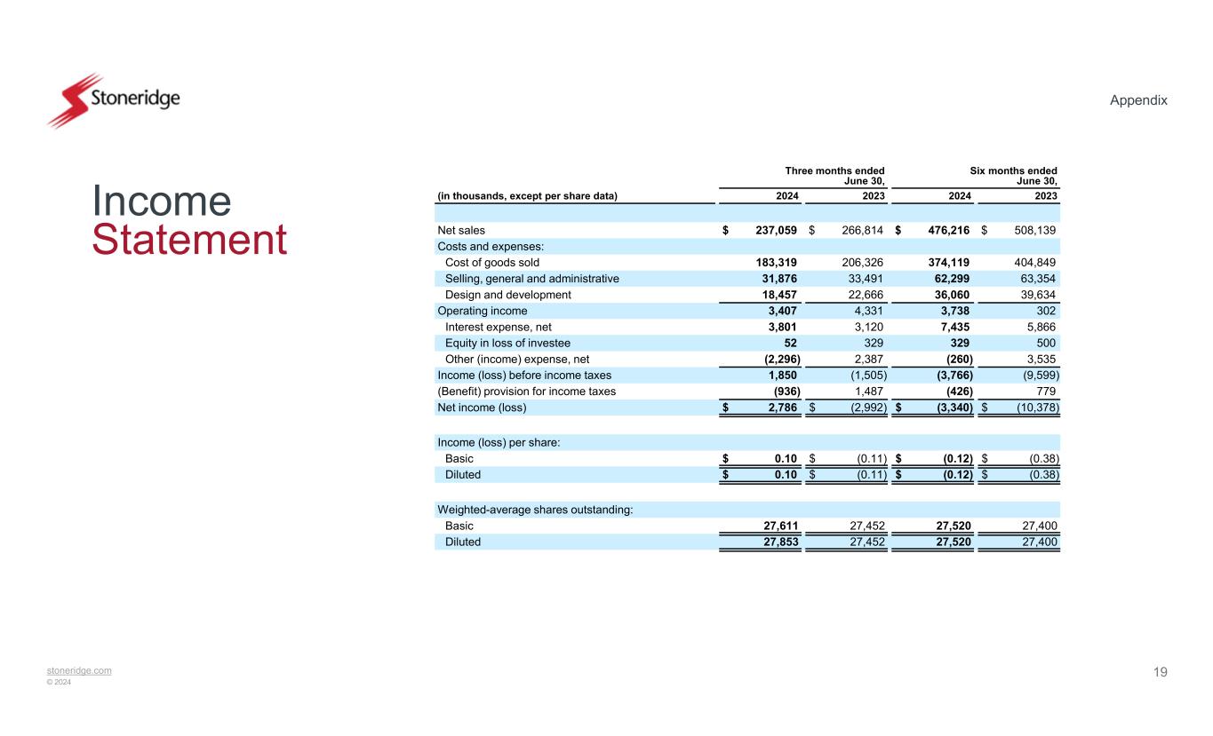 stoneridge.com © 2024 Appendix 18 Balance Sheets December 31, 2023 June 30, 2024(in thousands) (Unaudited) ASSETS Current assets: $ 40,841$ 42,112Cash and cash equivalents 166,545168,215Accounts receivable, less reserves of $620 and $1,058, respectively 187,758178,749Inventories, net 34,24632,882Prepaid expenses and other current assets 429,390421,958Total current assets Long-term assets: 110,126103,061Property, plant and equipment, net 47,31443,586Intangible assets, net 35,29534,244Goodwill 10,7958,722Operating lease right-of-use asset 46,98055,080Investments and other long-term assets, net 250,510244,693Total long-term assets $ 679,900$ 666,651Total assets LIABILITIES AND SHAREHOLDERS' EQUITY Current liabilities: $ 2,113$ 2,064Current portion of debt 111,925108,085Accounts payable 64,20376,098Accrued expenses and other current liabilities 178,241186,247Total current liabilities Long-term liabilities: 189,346187,417Revolving credit facility 7,2246,276Deferred income taxes 7,6845,814Operating lease long-term liability 9,68810,446Other long-term liabilities 213,942209,953Total long-term liabilities Shareholders' equity: ——Preferred Shares, without par value, 5,000 shares authorized, none issued —— Common Shares, without par value, 60,000 shares authorized, 28,966 and 28,966 shares issued and 27,679 and 27,549 shares outstanding at June 30, 2024 and December 31, 2023, respectively, with no stated value 227,340224,599Additional paid-in capital (43,344)(39,066) Common Shares held in treasury, 1,287 and 1,417 shares at June 30, 2024 and December 31, 2023, respectively, at cost 196,509193,169Retained earnings (92,788)(108,251)Accumulated other comprehensive loss 287,717270,451Total shareholders' equity $ 679,900$ 666,651Total liabilities and shareholders' equity