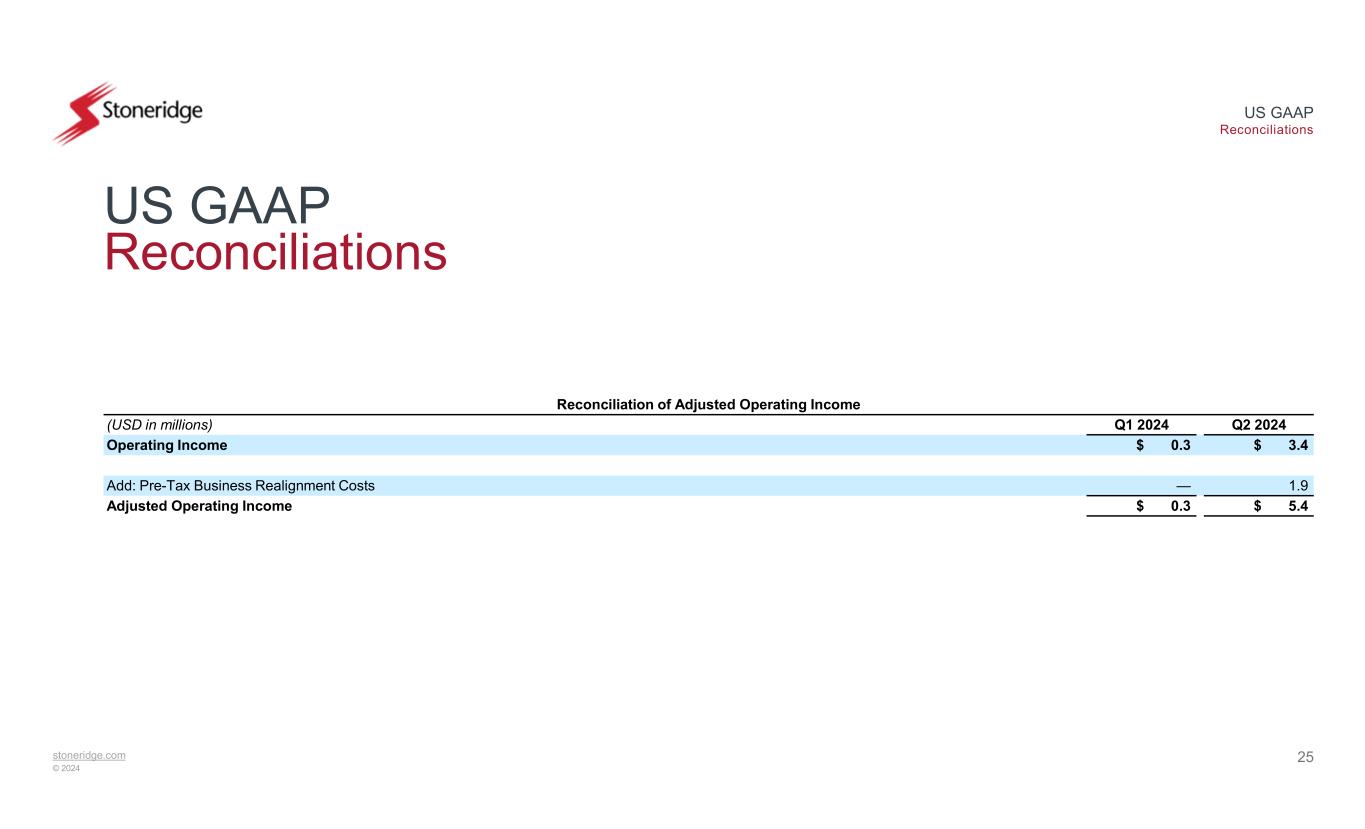 stoneridge.com © 2024 US GAAP Reconciliations 24 US GAAP Reconciliations Reconciliation of Q2 2024 Adjusted EPS Q2 2024 EPSQ2 2024(USD in millions, except EPS) $ 0.10$ 2.8Net Income 0.071.9Add: After-Tax Business Realignment Costs $ 0.17$ 4.7Adjusted Net Income