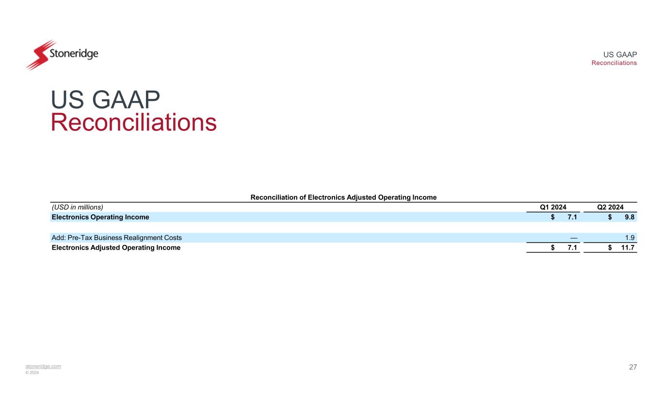 stoneridge.com © 2024 US GAAP Reconciliations 26 US GAAP Reconciliations Reconciliation of Adjusted EBITDA Q2 2024Q1 2024Q4 2023Q3 2023Q2 2023Q1 2023(USD in millions) $ 1.9$ (5.6)$ 3.2$ 4.4$ (1.5)$ (8.1)Income (Loss) Before Tax 3.83.63.83.33.12.7Interest expense, net 8.58.68.48.58.48.3Depreciation and amortization $ 14.2$ 6.6$ 15.5$ 16.2$ 10.0$ 3.0EBITDA 1.9—0.11.21.91.3Add: Pre-Tax Business Realignment Costs —————(0.8)Less: Pre-Tax Gain on Disposal of Fixed Assets —————0.1Add: Pre-Tax Environmental Remediation Costs ———(0.5)——Add: Pre-Tax Brazilian Indirect Tax Credits, Net $ 16.1$ 6.6$ 15.6$ 17.0$ 11.9$ 3.6Adjusted EBITDA