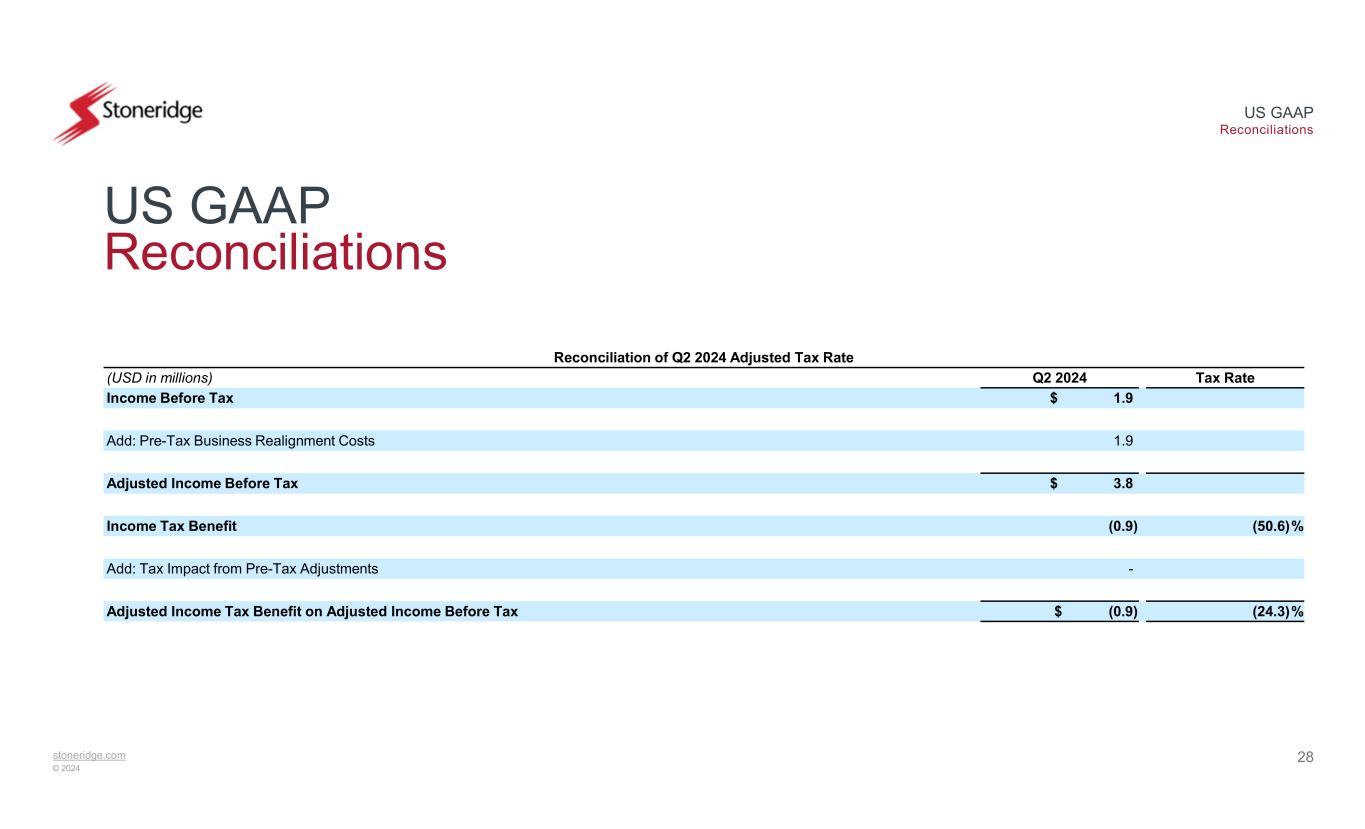 stoneridge.com © 2024 US GAAP Reconciliations 27 US GAAP Reconciliations Reconciliation of Electronics Adjusted Operating Income Q2 2024Q1 2024(USD in millions) $ 9.8$ 7.1Electronics Operating Income 1.9—Add: Pre-Tax Business Realignment Costs $ 11.7$ 7.1Electronics Adjusted Operating Income