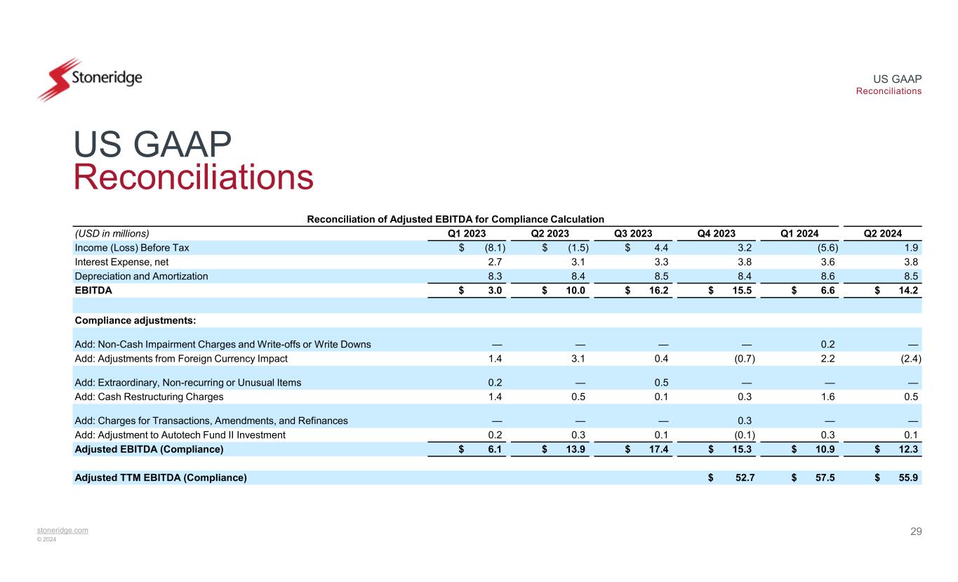 stoneridge.com © 2024 US GAAP Reconciliations 28 US GAAP Reconciliations Reconciliation of Q2 2024 Adjusted Tax Rate Tax RateQ2 2024(USD in millions) $ 1.9Income Before Tax 1.9Add: Pre-Tax Business Realignment Costs $ 3.8Adjusted Income Before Tax (50.6)%(0.9)Income Tax Benefit -Add: Tax Impact from Pre-Tax Adjustments (24.3)%$ (0.9)Adjusted Income Tax Benefit on Adjusted Income Before Tax