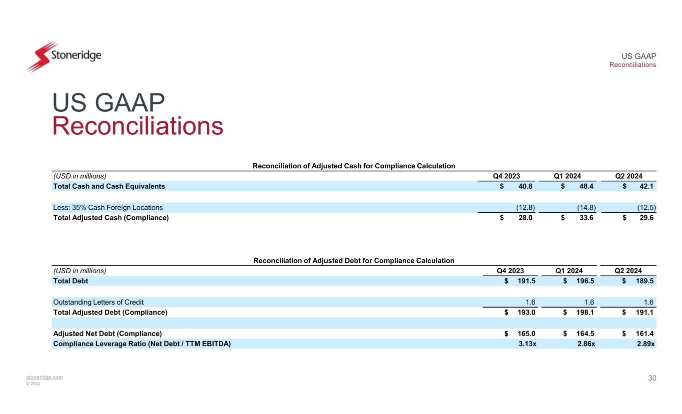 stoneridge.com © 2024 US GAAP Reconciliations 29 US GAAP Reconciliations Reconciliation of Adjusted EBITDA for Compliance Calculation Q2 2024Q1 2024Q4 2023Q3 2023Q2 2023Q1 2023(USD in millions) 1.9(5.6)3.2$ 4.4$ (1.5)$ (8.1)Income (Loss) Before Tax 3.83.63.83.33.12.7Interest Expense, net 8.58.68.48.58.48.3Depreciation and Amortization $ 14.2$ 6.6$ 15.5$ 16.2$ 10.0$ 3.0EBITDA Compliance adjustments: —0.2————Add: Non-Cash Impairment Charges and Write-offs or Write Downs (2.4)2.2(0.7)0.43.11.4Add: Adjustments from Foreign Currency Impact ———0.5—0.2Add: Extraordinary, Non-recurring or Unusual Items 0.51.60.30.10.51.4Add: Cash Restructuring Charges ——0.3———Add: Charges for Transactions, Amendments, and Refinances 0.10.3(0.1)0.10.30.2Add: Adjustment to Autotech Fund II Investment $ 12.3$ 10.9$ 15.3$ 17.4$ 13.9$ 6.1Adjusted EBITDA (Compliance) $ 55.9$ 57.5$ 52.7Adjusted TTM EBITDA (Compliance)
