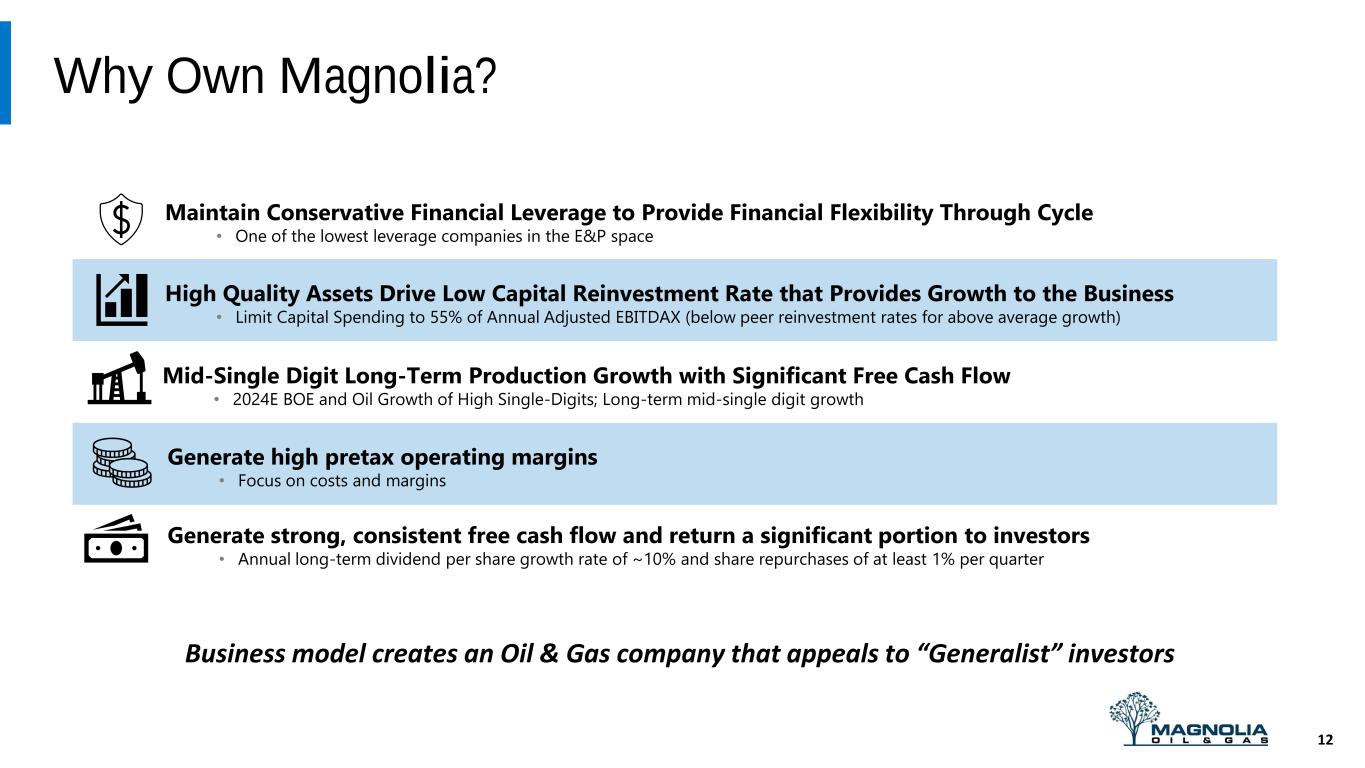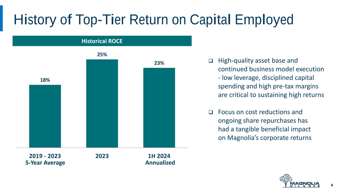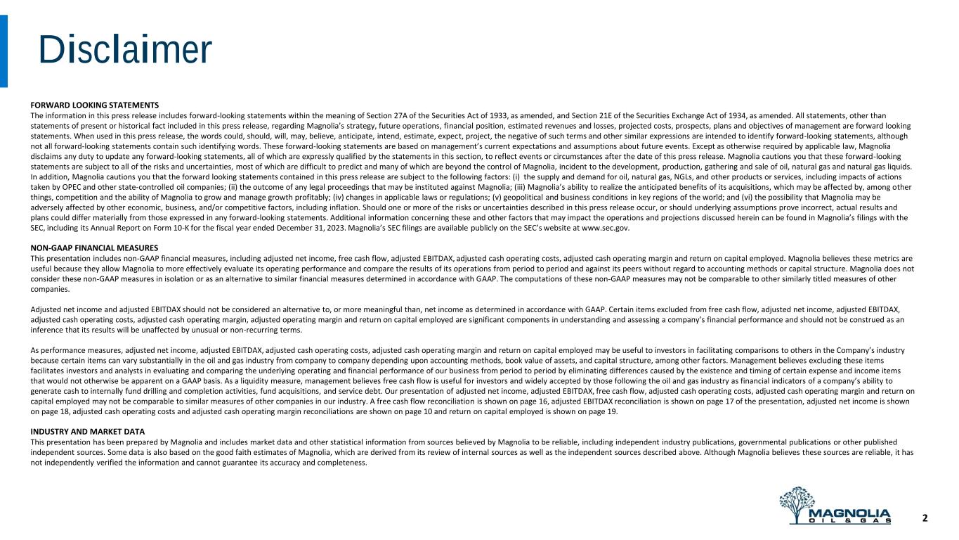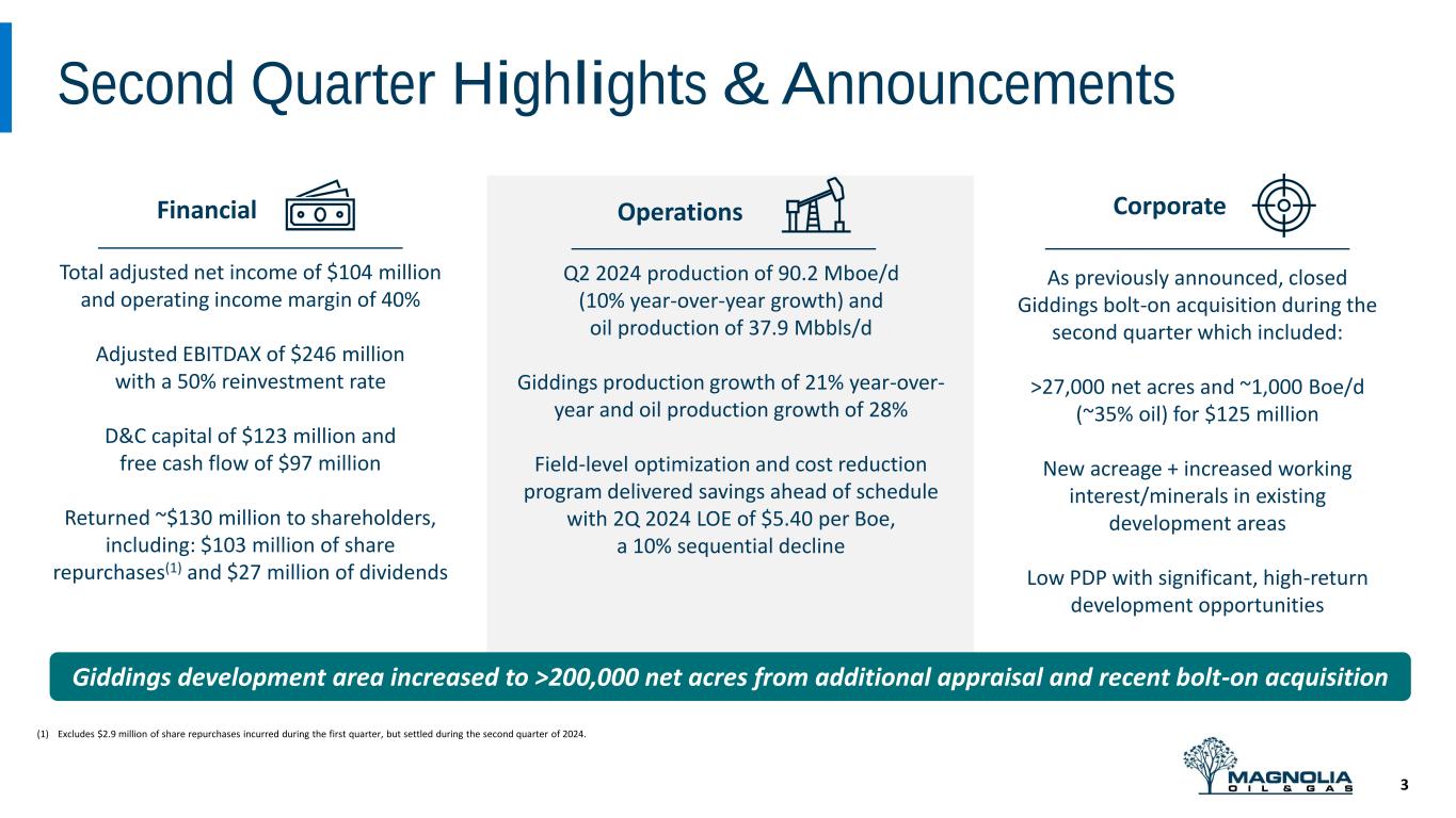 Disclaimer 2 12% FORWARD LOOKING STATEMENTS The information in this press release includes forward-looking statements within the meaning of Section 27A of the Securities Act of 1933, as amended, and Section 21E of the Securities Exchange Act of 1934, as amended. All statements, other than statements of present or historical fact included in this press release, regarding Magnolia’s strategy, future operations, financial position, estimated revenues and losses, projected costs, prospects, plans and objectives of management are forward looking statements. When used in this press release, the words could, should, will, may, believe, anticipate, intend, estimate, expect, project, the negative of such terms and other similar expressions are intended to identify forward-looking statements, although not all forward-looking statements contain such identifying words. These forward-looking statements are based on management’s current expectations and assumptions about future events. Except as otherwise required by applicable law, Magnolia disclaims any duty to update any forward-looking statements, all of which are expressly qualified by the statements in this section, to reflect events or circumstances after the date of this press release. Magnolia cautions you that these forward-looking statements are subject to all of the risks and uncertainties, most of which are difficult to predict and many of which are beyond the control of Magnolia, incident to the development, production, gathering and sale of oil, natural gas and natural gas liquids. In addition, Magnolia cautions you that the forward looking statements contained in this press release are subject to the following factors: (i) the supply and demand for oil, natural gas, NGLs, and other products or services, including impacts of actions taken by OPEC and other state-controlled oil companies; (ii) the outcome of any legal proceedings that may be instituted against Magnolia; (iii) Magnolia’s ability to realize the anticipated benefits of its acquisitions, which may be affected by, among other things, competition and the ability of Magnolia to grow and manage growth profitably; (iv) changes in applicable laws or regulations; (v) geopolitical and business conditions in key regions of the world; and (vi) the possibility that Magnolia may be adversely affected by other economic, business, and/or competitive factors, including inflation. Should one or more of the risks or uncertainties described in this press release occur, or should underlying assumptions prove incorrect, actual results and plans could differ materially from those expressed in any forward-looking statements. Additional information concerning these and other factors that may impact the operations and projections discussed herein can be found in Magnolia’s filings with the SEC, including its Annual Report on Form 10-K for the fiscal year ended December 31, 2023. Magnolia’s SEC filings are available publicly on the SEC’s website at www.sec.gov. NON-GAAP FINANCIAL MEASURES This presentation includes non-GAAP financial measures, including adjusted net income, free cash flow, adjusted EBITDAX, adjusted cash operating costs, adjusted cash operating margin and return on capital employed. Magnolia believes these metrics are useful because they allow Magnolia to more effectively evaluate its operating performance and compare the results of its operations from period to period and against its peers without regard to accounting methods or capital structure. Magnolia does not consider these non-GAAP measures in isolation or as an alternative to similar financial measures determined in accordance with GAAP. The computations of these non-GAAP measures may not be comparable to other similarly titled measures of other companies. Adjusted net income and adjusted EBITDAX should not be considered an alternative to, or more meaningful than, net income as determined in accordance with GAAP. Certain items excluded from free cash flow, adjusted net income, adjusted EBITDAX, adjusted cash operating costs, adjusted cash operating margin, adjusted operating margin and return on capital employed are significant components in understanding and assessing a company’s financial performance and should not be construed as an inference that its results will be unaffected by unusual or non-recurring terms. As performance measures, adjusted net income, adjusted EBITDAX, adjusted cash operating costs, adjusted cash operating margin and return on capital employed may be useful to investors in facilitating comparisons to others in the Company’s industry because certain items can vary substantially in the oil and gas industry from company to company depending upon accounting methods, book value of assets, and capital structure, among other factors. Management believes excluding these items facilitates investors and analysts in evaluating and comparing the underlying operating and financial performance of our business from period to period by eliminating differences caused by the existence and timing of certain expense and income items that would not otherwise be apparent on a GAAP basis. As a liquidity measure, management believes free cash flow is useful for investors and widely accepted by those following the oil and gas industry as financial indicators of a company’s ability to generate cash to internally fund drilling and completion activities, fund acquisitions, and service debt. Our presentation of adjusted net income, adjusted EBITDAX, free cash flow, adjusted cash operating costs, adjusted cash operating margin and return on capital employed may not be comparable to similar measures of other companies in our industry. A free cash flow reconciliation is shown on page 16, adjusted EBITDAX reconciliation is shown on page 17 of the presentation, adjusted net income is shown on page 18, adjusted cash operating costs and adjusted cash operating margin reconciliations are shown on page 10 and return o