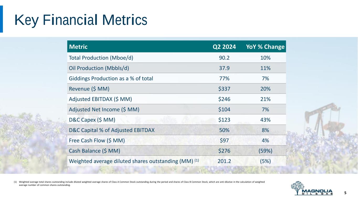 History of Top-Tier Return on Capital Employed 4 ❑ High-quality asset base and continued business model execution - low leverage, disciplined capital spending and high pre-tax margins are critical to sustaining high returns ❑ Focus on cost reductions and ongoing share repurchases has had a tangible beneficial impact on Magnolia’s corporate returns 18% 25% 23% 2019 - 2023 2023 1H 2024 5-Year Average Annualized Historical ROCE