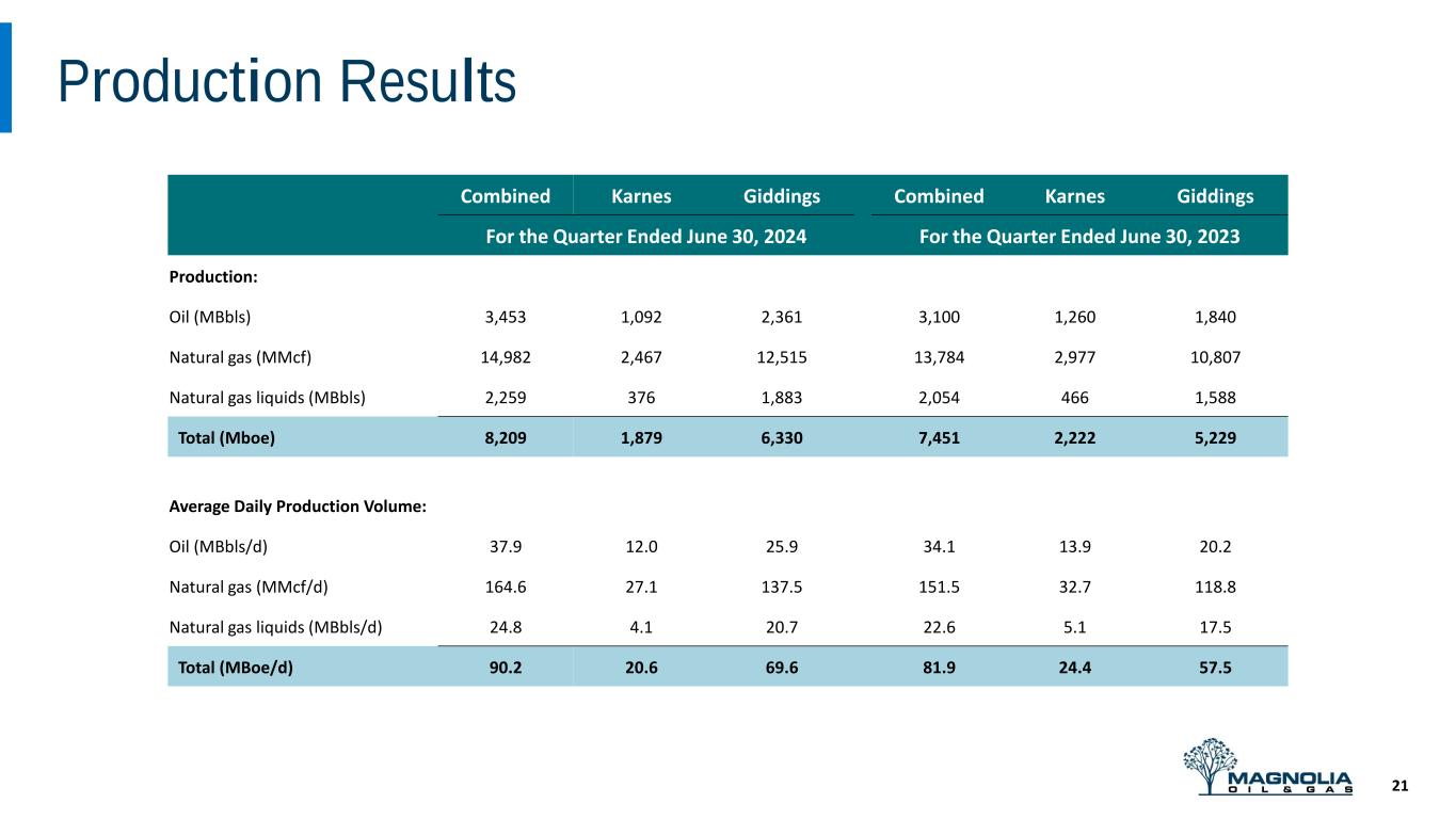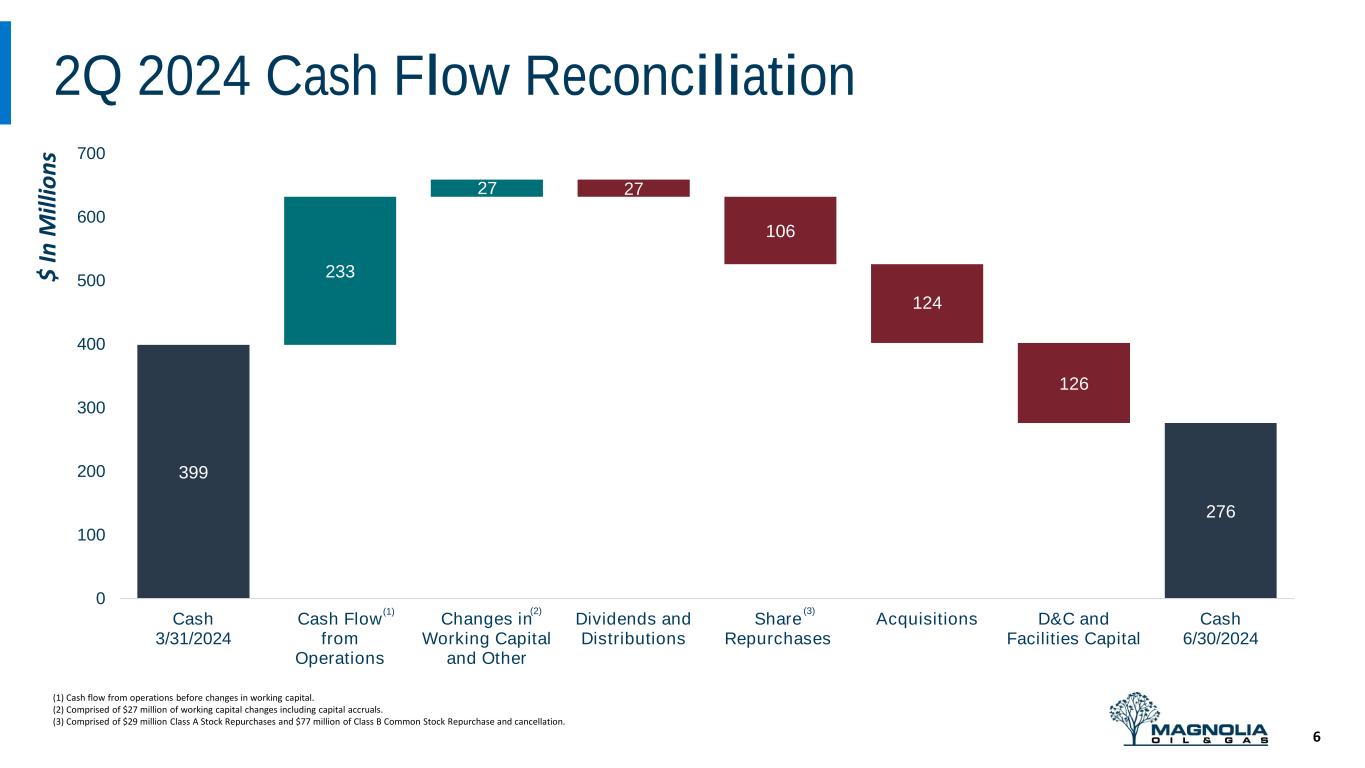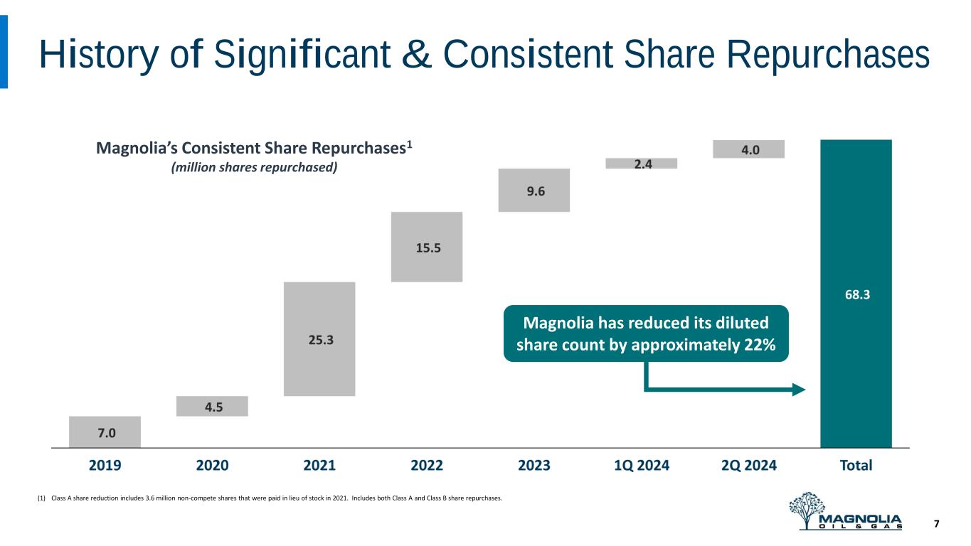 •The Company repurchased a total of 4 million shares of its Class A and Class B Common Stock during the second quarter for $102.7 million. Magnolia has 5.9 million Class A Common shares remaining under its current repurchase authorization, which are specifically allocated toward open market share repurchases.