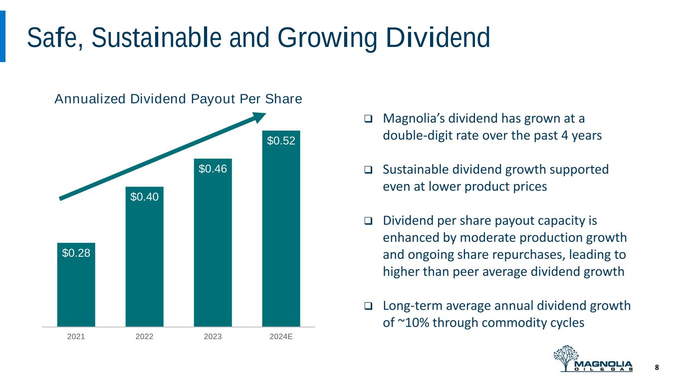 History of Significant & Consistent Share Repurchases (1) Class A share reduction includes 3.6 million non-compete shares that were paid in lieu of stock in 2021. Includes both Class A and Class B share repurchases. 7 Magnolia has reduced its diluted share count by approximately 22% Magnolia’s Consistent Share Repurchases1 (million shares repurchased)