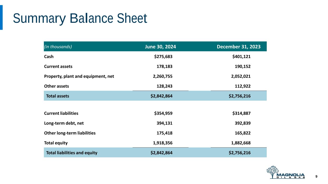 Safe, Sustainable and Growing Dividend 8 $0.28 $0.40 $0.46 $0.52 2021 2022 2023 2024E Annualized Dividend Payout Per Share ❑ Magnolia’s dividend has grown at a double-digit rate over the past 4 years ❑ Sustainable dividend growth supported even at lower product prices ❑ Dividend per share payout capacity is enhanced by moderate production growth and ongoing share repurchases, leading to higher than peer average dividend growth ❑ Long-term average annual dividend growth of ~10% through commodity cycles