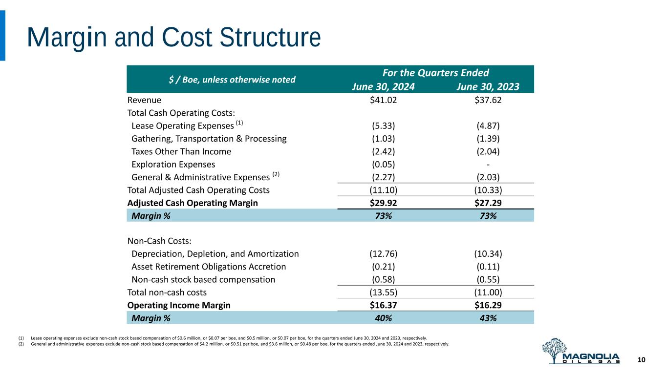 (2) General and administrative expenses exclude non-cash stock based compensation of $4.2 million, or $0.51 per boe, and $3.6 million, or $0.48 per boe, for the quarters ended June 30, 2024 and 2023, respectively.