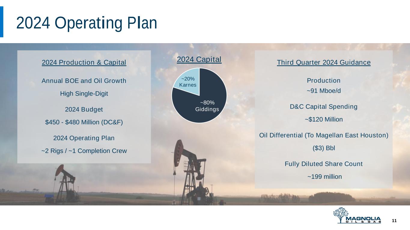 •Magnolia reported second quarter 2024 net income attributable to Class A Common Stock of $95.6 million, or $0.51 per diluted share. Second quarter 2024 total net income was $105.1 million and total adjusted net income(1) was $104.3 million. Diluted weighted average total shares outstanding decreased by 5% to 201.2 million(2) compared to second quarter 2023.