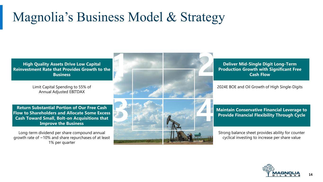 Why Own Magnolia? 12 Business model creates an Oil & Gas company that appeals to “Generalist” investors High Quality Assets Drive Low Capital Reinvestment Rate that Provides Growth to the Business • Limit Capital Spending to 55% of Annual Adjusted EBITDAX (below peer reinvestment rates for above average growth) Mid-Single Digit Long-Term Production Growth with Significant Free Cash Flow • 2024E BOE and Oil Growth of High Single-Digits; Long-term mid-single digit growth Generate strong, consistent free cash flow and return a significant portion to investors • Annual long-term dividend per share growth rate of ~10% and share repurchases of at least 1% per quarter Maintain Conservative Financial Leverage to Provide Financial Flexibility Through Cycle • One of the lowest leverage companies in the E&P space Generate high pretax operating margins • Focus on costs and margins