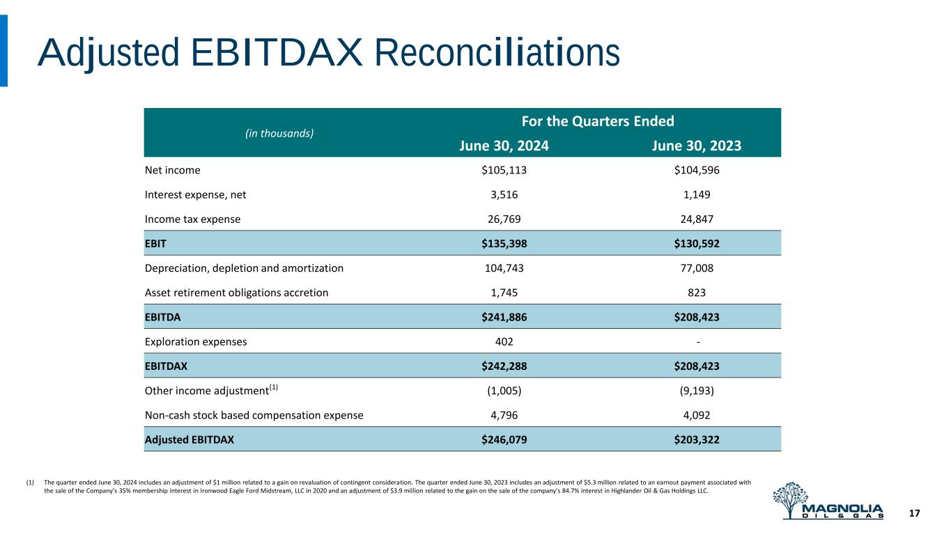 Free Cash Flow Reconciliations 16 (in thousands) For the Quarters Ended June 30, 2024 June 30, 2023 Net cash provided by operating activities $269,398 $201,775 Add back: net change in operating assets and liabilities (36,665) 2,721 Cash flows from operations before net change in operating assets and liabilities $232,733 $204,496 Additions to oil and natural gas properties (126,077) (86,743) Changes in working capital associated with additions to oil and natural gas properties (9,957) (24,447) Free cash flow $96,699 $93,306