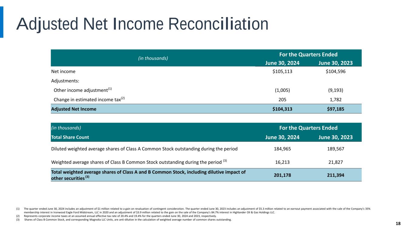 Adjusted EBITDAX Reconciliations 17 (in thousands) For the Quarters Ended June 30, 2024 June 30, 2023 Net income $105,113 $104,596 Interest expense, net 3,516 1,149 Income tax expense 26,769 24,847 EBIT $135,398 $130,592 Depreciation, depletion and amortization 104,743 77,008 Asset retirement obligations accretion 1,745 823 EBITDA $241,886 $208,423 Exploration expenses 402 - EBITDAX $242,288 $208,423 Other income adjustment(1) (1,005) (9,193) Non-cash stock based compensation expense 4,796 4,092 Adjusted EBITDAX $246,079 $203,322 (1) The quarter ended June 30, 2024 includes an adjustment of $1 million related to a gain on revaluation of contingent consideration. The quarter ended June 30, 2023 includes an adjustment of $5.3 million related to an earnout payment associated with the sale of the Company’s 35% membership interest in Ironwood Eagle Ford Midstream, LLC in 2020 and an adjustment of $3.9 million related to the gain on the sale of the company’s 84.7% interest in Highlander Oil & Gas Holdings LLC.