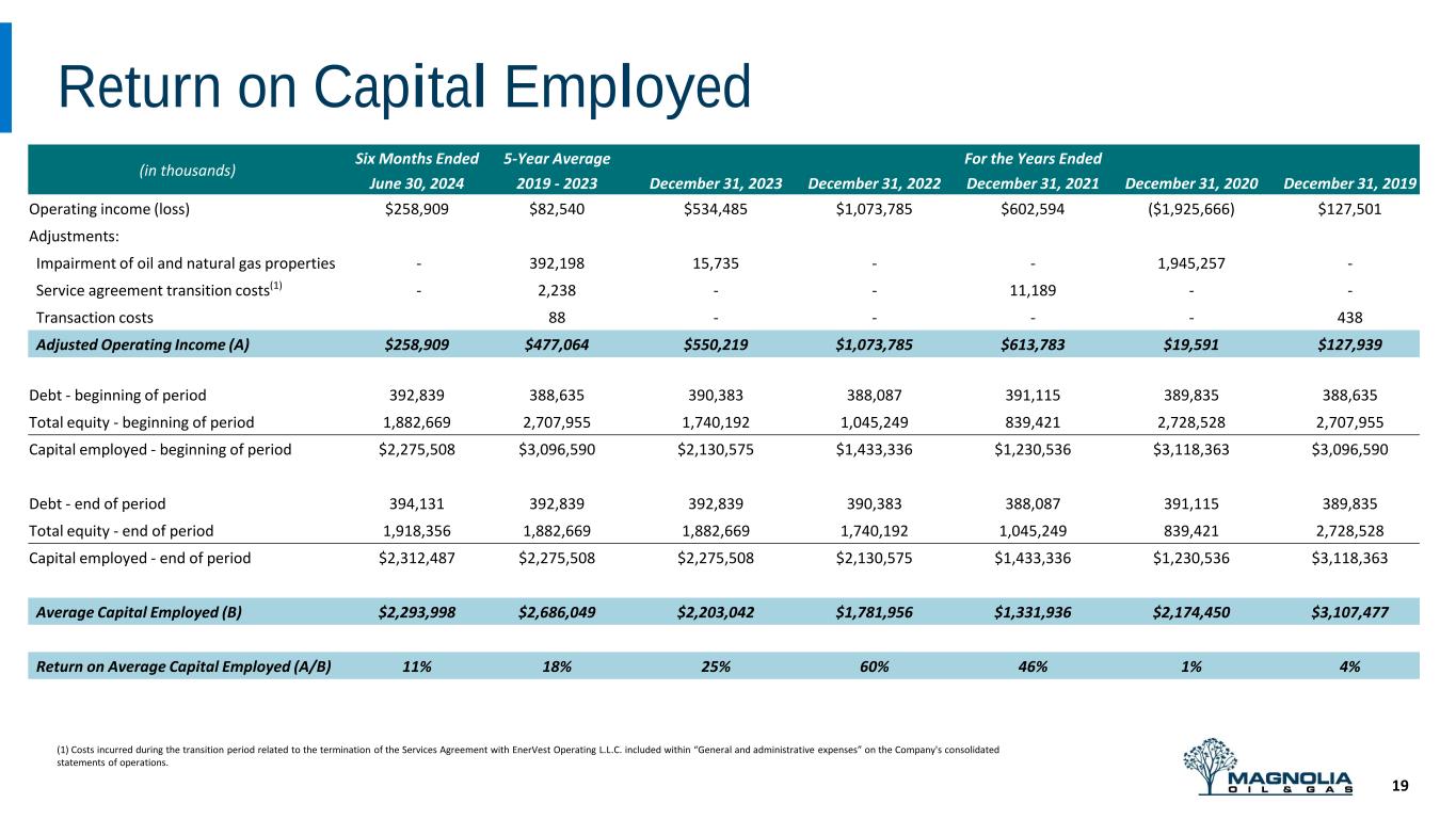 Adjusted Net Income Reconciliation 18 (1) The quarter ended June 30, 2024 includes an adjustment of $1 million related to a gain on revaluation of contingent consideration. The quarter ended June 30, 2023 includes an adjustment of $5.3 million related to an earnout payment associated with the sale of the Company’s 35% membership interest in Ironwood Eagle Ford Midstream, LLC in 2020 and an adjustment of $3.9 million related to the gain on the sale of the Company’s 84.7% interest in Highlander Oil & Gas Holdings LLC. (2) Represents corporate income taxes at an assumed annual effective tax rate of 20.4% and 19.4% for the quarters ended June 30, 2024 and 2023, respectively. (3) Shares of Class B Common Stock, and corresponding Magnolia LLC Units, are anti-dilutive in the calculation of weighted average number of common shares outstanding. (in thousands) For the Quarters Ended June 30, 2024 June 30, 2023 Net income $105,113 $104,596 Adjustments: Other income adjustment(1) (1,005) (9,193) Change in estimated income tax(2) 205 1,782 Adjusted Net Income $104,313 $97,185 (in thousands) For the Quarters Ended Total Share Count June 30, 2024 June 30, 2023 Diluted weighted average shares of Class A Common Stock outstanding during the period 184,965 189,567 Weighted average shares of Class B Common Stock outstanding during the period (3) 16,213 21,827 Total weighted average shares of Class A and B Common Stock, including dilutive impact of other securities (3) 201,178 211,394