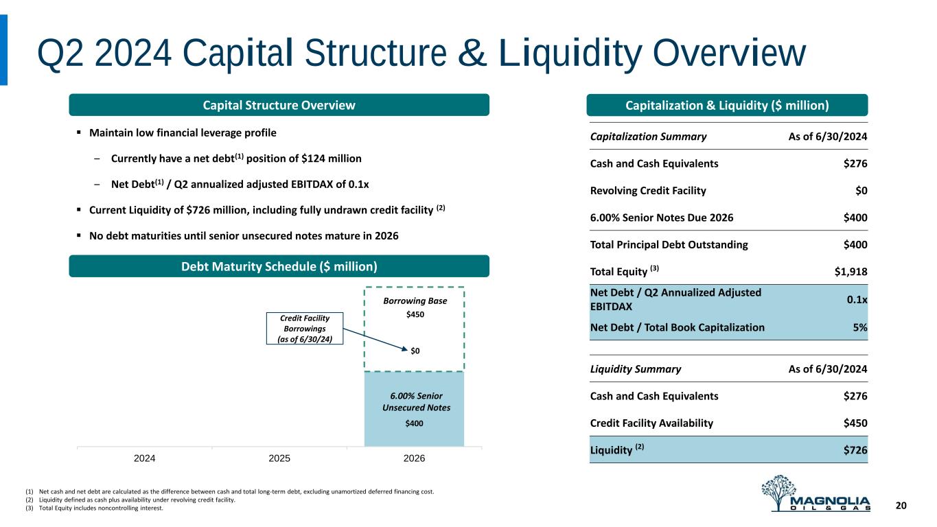 Return on Capital Employed 19 (1) Costs incurred during the transition period related to the termination of the Services Agreement with EnerVest Operating L.L.C. included within “General and administrative expenses” on the Company's consolidated statements of operations. (in thousands) Six Months Ended 5-Year Average For the Years Ended June 30, 2024 2019 - 2023 December 31, 2023 December 31, 2022 December 31, 2021 December 31, 2020 December 31, 2019 Operating income (loss) $258,909 $82,540 $534,485 $1,073,785 $602,594 ($1,925,666) $127,501 Adjustments: Impairment of oil and natural gas properties - 392,198 15,735 - - 1,945,257 - Service agreement transition costs(1) - 2,238 - - 11,189 - - Transaction costs 88 - - - - 438 Adjusted Operating Income (A) $258,909 $477,064 $550,219 $1,073,785 $613,783 $19,591 $127,939 Debt - beginning of period 392,839 388,635 390,383 388,087 391,115 389,835 388,635 Total equity - beginning of period 1,882,669 2,707,955 1,740,192 1,045,249 839,421 2,728,528 2,707,955 Capital employed - beginning of period $2,275,508 $3,096,590 $2,130,575 $1,433,336 $1,230,536 $3,118,363 $3,096,590 Debt - end of period 394,131 392,839 392,839 390,383 388,087 391,115 389,835 Total equity - end of period 1,918,356 1,882,669 1,882,669 1,740,192 1,045,249 839,421 2,728,528 Capital employed - end of period $2,312,487 $2,275,508 $2,275,508 $2,130,575 $1,433,336 $1,230,536 $3,118,363 Average Capital Employed (B) $2,293,998 $2,686,049 $2,203,042 $1,781,956 $1,331,936 $2,174,450 $3,107,477 Return on Average Capital Employed (A/B) 11% 18% 25% 60% 46% 1% 4%