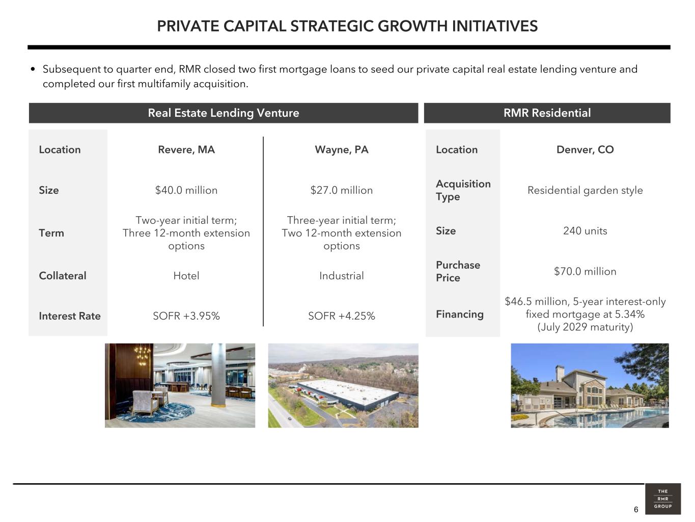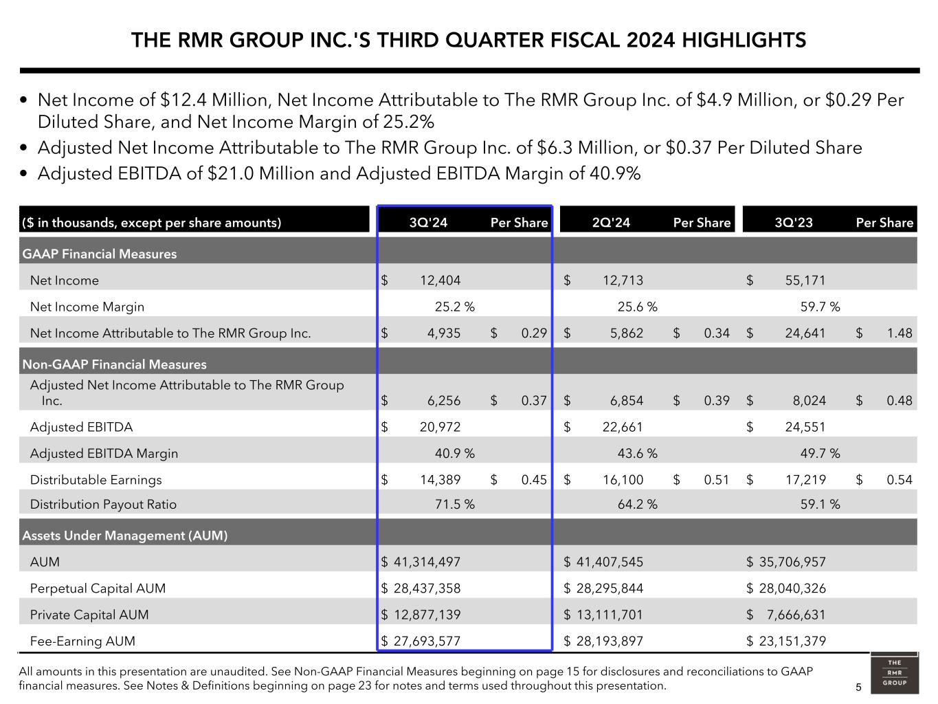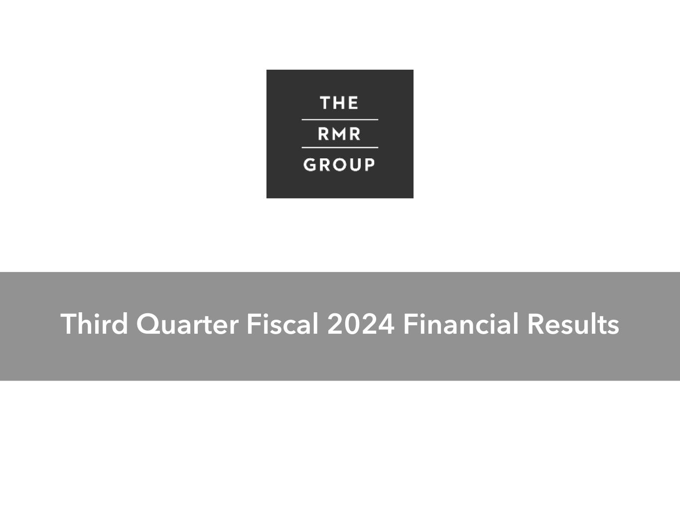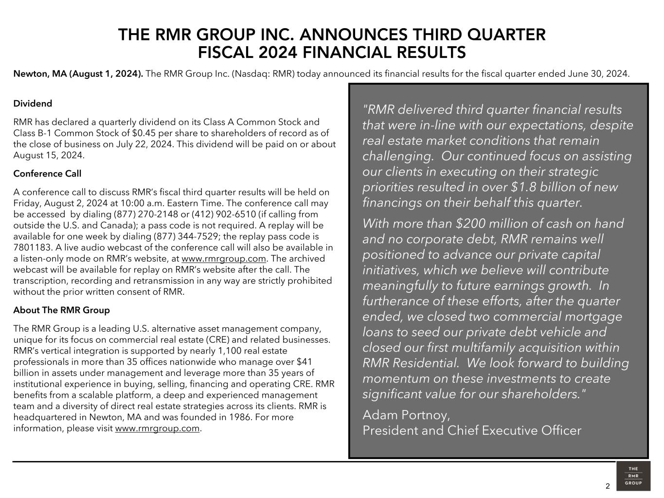 2 Dividend RMR has declared a quarterly dividend on its Class A Common Stock and Class B-1 Common Stock of $0.45 per share to shareholders of record as of the close of business on July 22, 2024. This dividend will be paid on or about August 15, 2024. Conference Call A conference call to discuss RMR’s fiscal third quarter results will be held on Friday, August 2, 2024 at 10:00 a.m. Eastern Time. The conference call may be accessed by dialing (877) 270-2148 or (412) 902-6510 (if calling from outside the U.S. and Canada); a pass code is not required. A replay will be available for one week by dialing (877) 344-7529; the replay pass code is 7801183. A live audio webcast of the conference call will also be available in a listen-only mode on RMR’s website, at www.rmrgroup.com. The archived webcast will be available for replay on RMR’s website after the call. The transcription, recording and retransmission in any way are strictly prohibited without the prior written consent of RMR. About The RMR Group The RMR Group is a leading U.S. alternative asset management company, unique for its focus on commercial real estate (CRE) and related businesses. RMR’s vertical integration is supported by nearly 1,100 real estate professionals in more than 35 offices nationwide who manage over $41 billion in assets under management and leverage more than 35 years of institutional experience in buying, selling, financing and operating CRE. RMR benefits from a scalable platform, a deep and experienced management team and a diversity of direct real estate strategies across its clients. RMR is headquartered in Newton, MA and was founded in 1986. For more information, please visit www.rmrgroup.com. "RMR delivered third quarter financial results that were in-line with our expectations, despite real estate market conditions that remain challenging. Our continued focus on assisting our clients in executing on their strategic priorities resulted in over $1.8 billion of new financings on their behalf this quarter. With more than $200 million of cash on hand and no corporate debt, RMR remains well positioned to advance our private capital initiatives, which we believe will contribute meaningfully to future earnings growth. In furtherance of these efforts, after the quarter ended, we closed two commercial mortgage loans to seed our private debt vehicle and closed our first multifamily acquisition within RMR Residential. We look forward to building momentum on these investments to create significant value for our shareholders." Adam Portnoy, President and Chief Executive Officer THE RMR GROUP INC. ANNOUNCES THIRD QUARTER FISCAL 2024 FINANCIAL RESULTS Newton, MA (August 1, 2024). The RMR Group Inc. (Nasdaq: RMR) today announced its financial results for the fiscal quarter ended June 30, 2024.