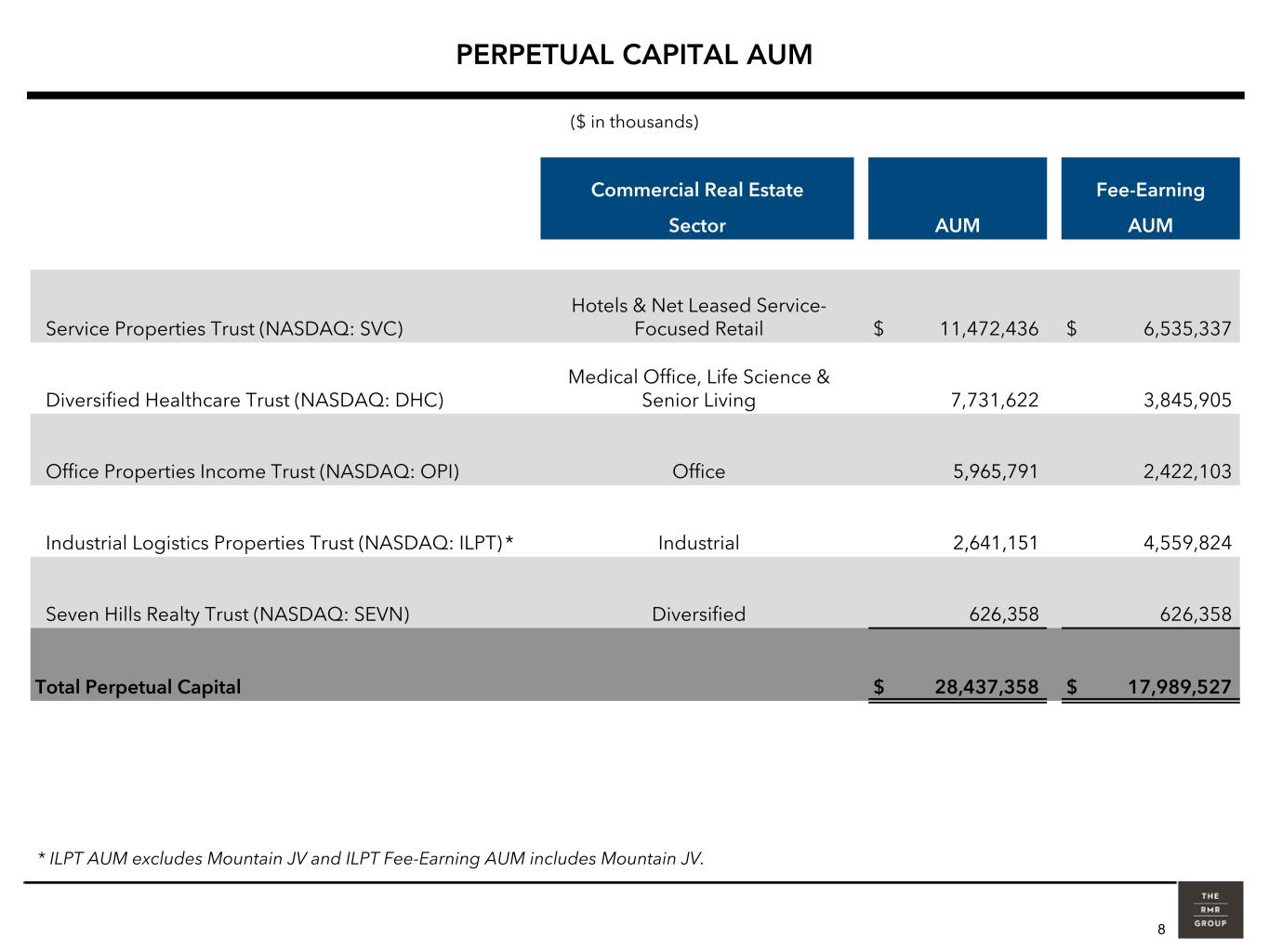 8 PERPETUAL CAPITAL AUM Commercial Real Estate Fee-Earning Sector AUM AUM Service Properties Trust (NASDAQ: SVC) Hotels & Net Leased Service- Focused Retail $ 11,472,436 $ 6,535,337 Diversified Healthcare Trust (NASDAQ: DHC) Medical Office, Life Science & Senior Living 7,731,622 3,845,905 Office Properties Income Trust (NASDAQ: OPI) Office 5,965,791 2,422,103 Industrial Logistics Properties Trust (NASDAQ: ILPT) * Industrial 2,641,151 4,559,824 Seven Hills Realty Trust (NASDAQ: SEVN) Diversified 626,358 626,358 Total Perpetual Capital $ 28,437,358 $ 17,989,527 ($ in thousands) * ILPT AUM excludes Mountain JV and ILPT Fee-Earning AUM includes Mountain JV.