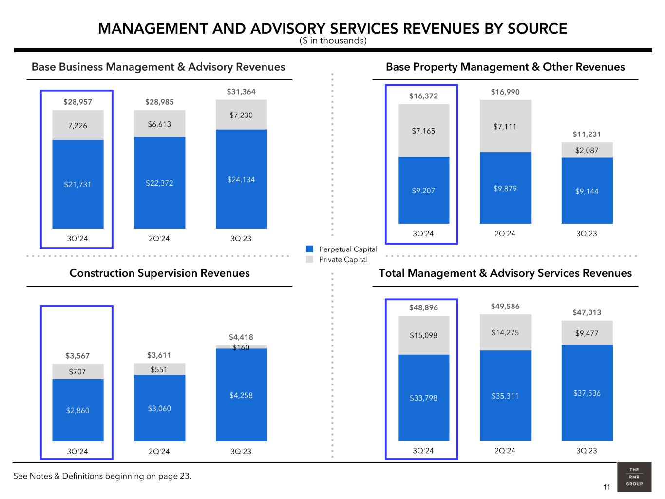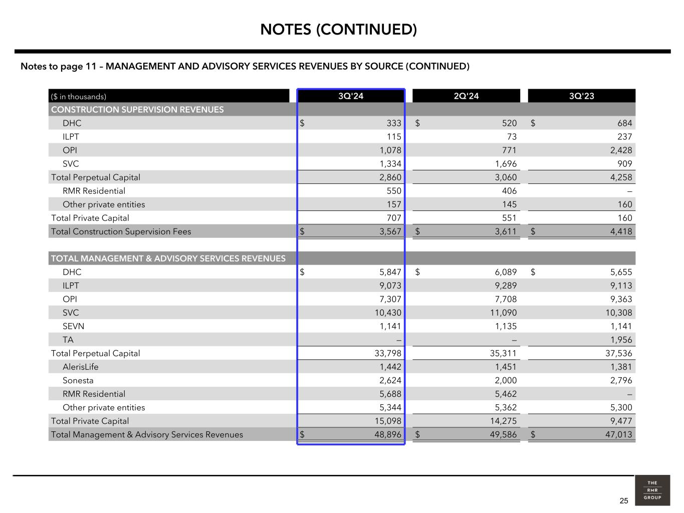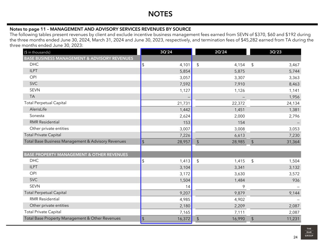 24 NOTES Notes to page 11 – MANAGEMENT AND ADVISORY SERVICES REVENUES BY SOURCE The following tables present revenues by client and exclude incentive business management fees earned from SEVN of $370, $60 and $192 during the three months ended June 30, 2024, March 31, 2024 and June 30, 2023, respectively, and termination fees of $45,282 earned from TA during the three months ended June 30, 2023: ($ in thousands) 3Q'24 2Q'24 3Q'23 BASE BUSINESS MANAGEMENT & ADVISORY REVENUES DHC $ 4,101 $ 4,154 $ 3,467 ILPT 5,854 5,875 5,744 OPI 3,057 3,307 3,363 SVC 7,592 7,910 8,463 SEVN 1,127 1,126 1,141 TA — — 1,956 Total Perpetual Capital 21,731 22,372 24,134 AlerisLife 1,442 1,451 1,381 Sonesta 2,624 2,000 2,796 RMR Residential 153 154 — Other private entities 3,007 3,008 3,053 Total Private Capital 7,226 6,613 7,230 Total Base Business Management & Advisory Revenues $ 28,957 $ 28,985 $ 31,364 BASE PROPERTY MANAGEMENT & OTHER REVENUES DHC $ 1,413 $ 1,415 $ 1,504 ILPT 3,104 3,341 3,132 OPI 3,172 3,630 3,572 SVC 1,504 1,484 936 SEVN 14 9 — Total Perpetual Capital 9,207 9,879 9,144 RMR Residential 4,985 4,902 — Other private entities 2,180 2,209 2,087 Total Private Capital 7,165 7,111 2,087 Total Base Property Management & Other Revenues $ 16,372 $ 16,990 $ 11,231