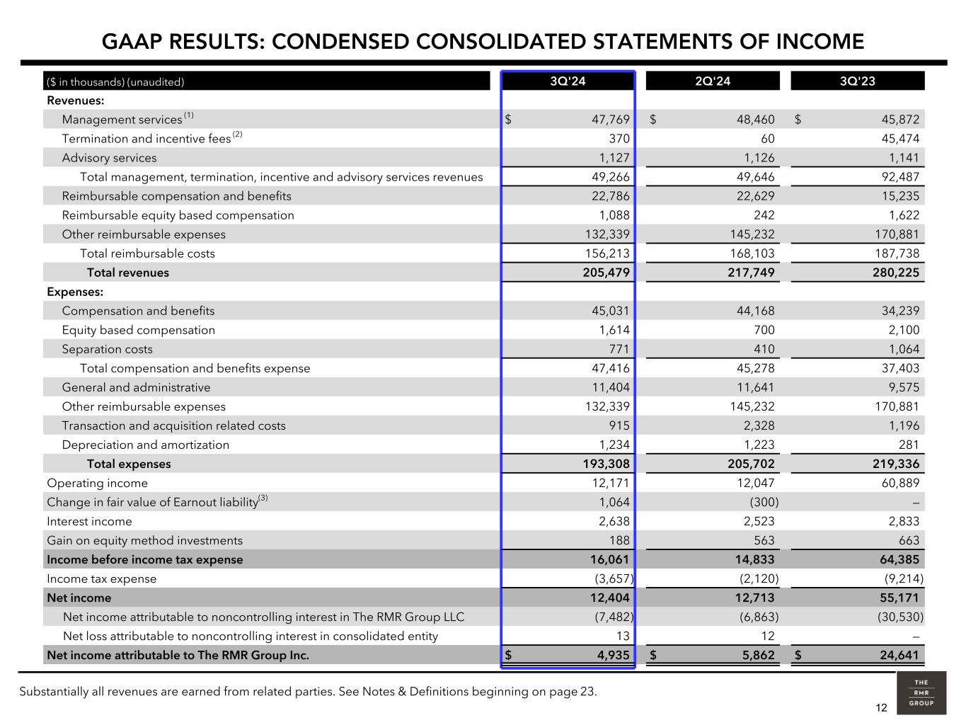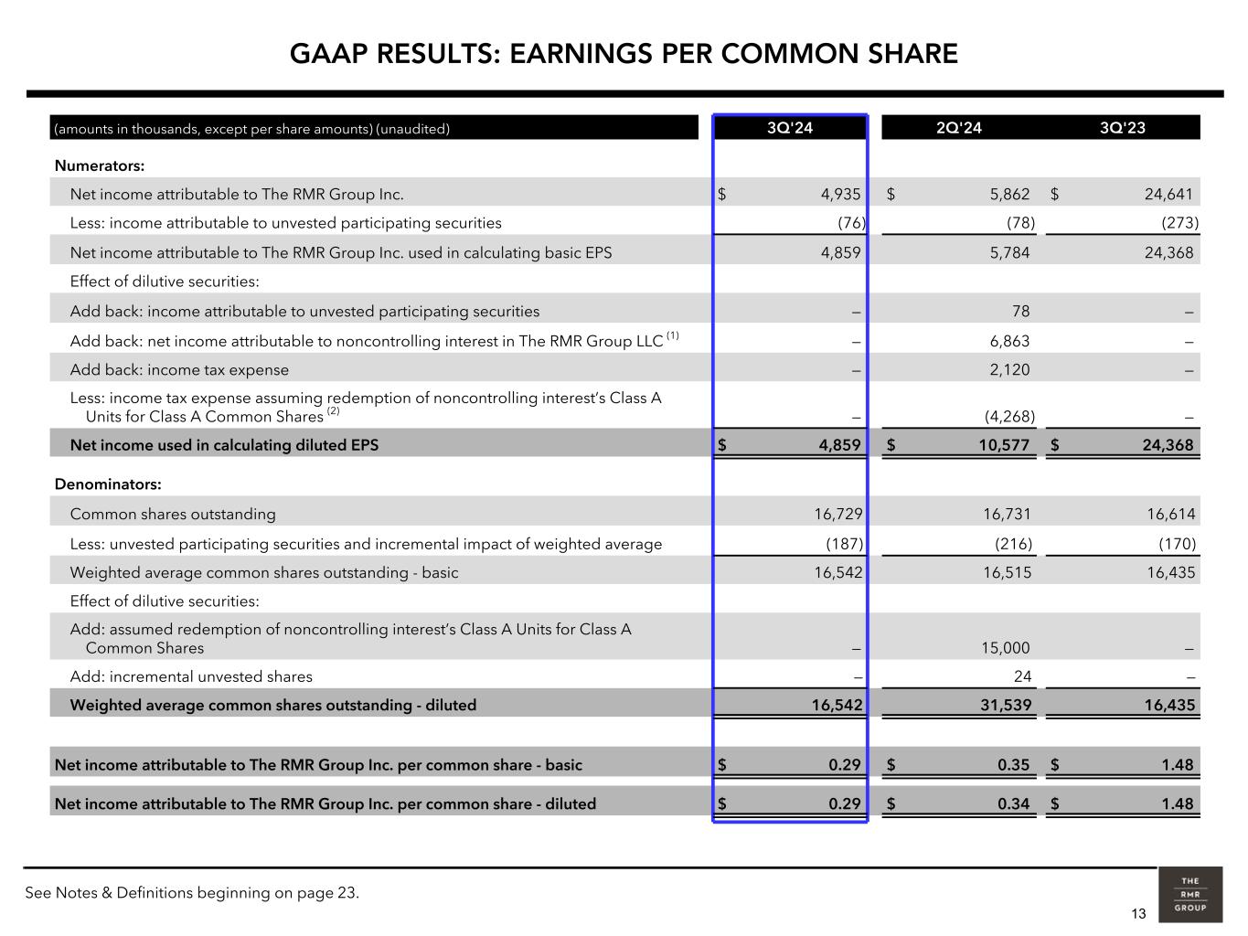 12 GAAP RESULTS: CONDENSED CONSOLIDATED STATEMENTS OF INCOME ($ in thousands) (unaudited) 3Q'24 2Q'24 3Q'23 Revenues: Management services (1) $ 47,769 $ 48,460 $ 45,872 Termination and incentive fees (2) 370 60 45,474 Advisory services 1,127 1,126 1,141 Total management, termination, incentive and advisory services revenues 49,266 49,646 92,487 Reimbursable compensation and benefits 22,786 22,629 15,235 Reimbursable equity based compensation 1,088 242 1,622 Other reimbursable expenses 132,339 145,232 170,881 Total reimbursable costs 156,213 168,103 187,738 Total revenues 205,479 217,749 280,225 Expenses: Compensation and benefits 45,031 44,168 34,239 Equity based compensation 1,614 700 2,100 Separation costs 771 410 1,064 Total compensation and benefits expense 47,416 45,278 37,403 General and administrative 11,404 11,641 9,575 Other reimbursable expenses 132,339 145,232 170,881 Transaction and acquisition related costs 915 2,328 1,196 Depreciation and amortization 1,234 1,223 281 Total expenses 193,308 205,702 219,336 Operating income 12,171 12,047 60,889 Change in fair value of Earnout liability(3) 1,064 (300) — Interest income 2,638 2,523 2,833 Gain on equity method investments 188 563 663 Income before income tax expense 16,061 14,833 64,385 Income tax expense (3,657) (2,120) (9,214) Net income 12,404 12,713 55,171 Net income attributable to noncontrolling interest in The RMR Group LLC (7,482) (6,863) (30,530) Net loss attributable to noncontrolling interest in consolidated entity 13 12 — Net income attributable to The RMR Group Inc. $ 4,935 $ 5,862 $ 24,641 Substantially all revenues are earned from related parties. See Notes & Definitions beginning on page 23.