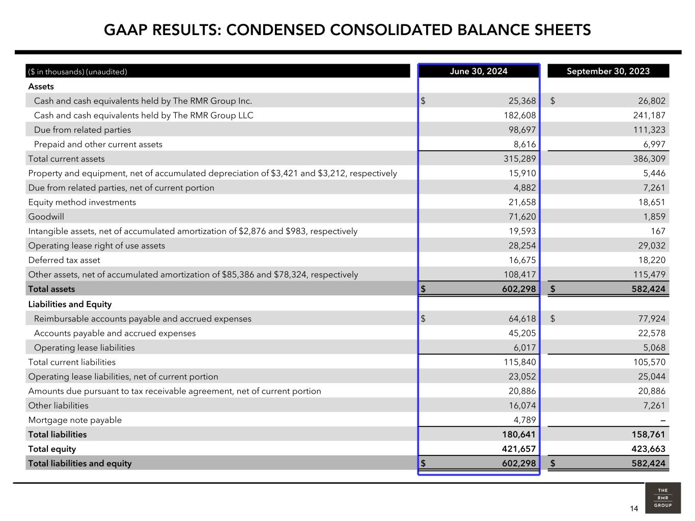 14 GAAP RESULTS: CONDENSED CONSOLIDATED BALANCE SHEETS ($ in thousands) (unaudited) June 30, 2024 September 30, 2023 Assets Cash and cash equivalents held by The RMR Group Inc. $ 25,368 $ 26,802 Cash and cash equivalents held by The RMR Group LLC 182,608 241,187 Due from related parties 98,697 111,323 Prepaid and other current assets 8,616 6,997 Total current assets 315,289 386,309 Property and equipment, net of accumulated depreciation of $3,421 and $3,212, respectively 15,910 5,446 Due from related parties, net of current portion 4,882 7,261 Equity method investments 21,658 18,651 Goodwill 71,620 1,859 Intangible assets, net of accumulated amortization of $2,876 and $983, respectively 19,593 167 Operating lease right of use assets 28,254 29,032 Deferred tax asset 16,675 18,220 Other assets, net of accumulated amortization of $85,386 and $78,324, respectively 108,417 115,479 Total assets $ 602,298 $ 582,424 Liabilities and Equity Reimbursable accounts payable and accrued expenses $ 64,618 $ 77,924 Accounts payable and accrued expenses 45,205 22,578 Operating lease liabilities 6,017 5,068 Total current liabilities 115,840 105,570 Operating lease liabilities, net of current portion 23,052 25,044 Amounts due pursuant to tax receivable agreement, net of current portion 20,886 20,886 Other liabilities 16,074 7,261 Mortgage note payable 4,789 — Total liabilities 180,641 158,761 Total equity 421,657 423,663 Total liabilities and equity $ 602,298 $ 582,424