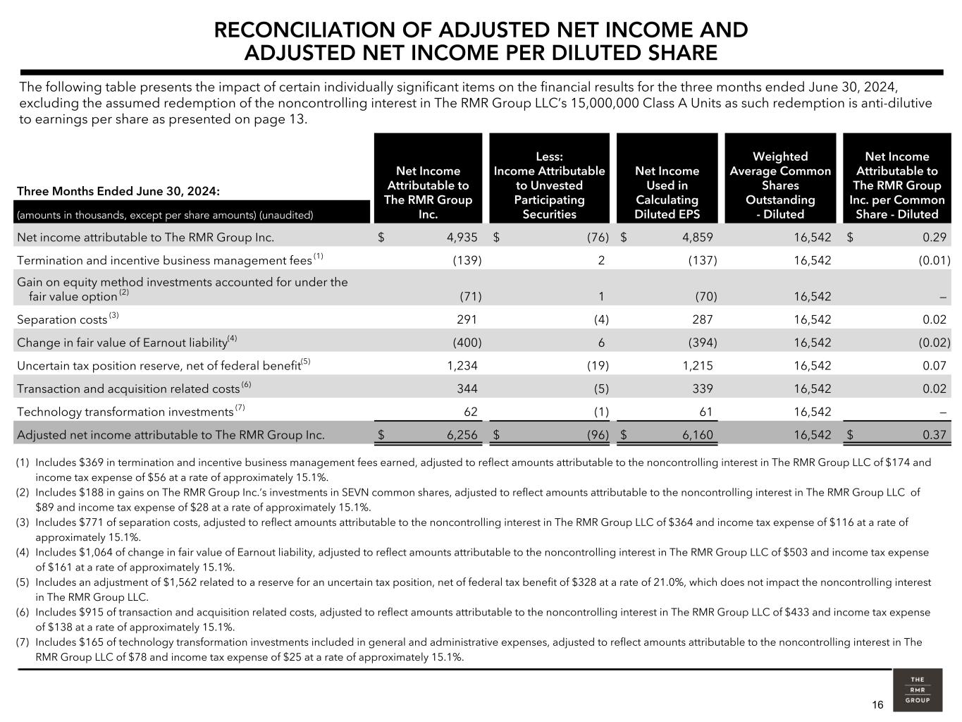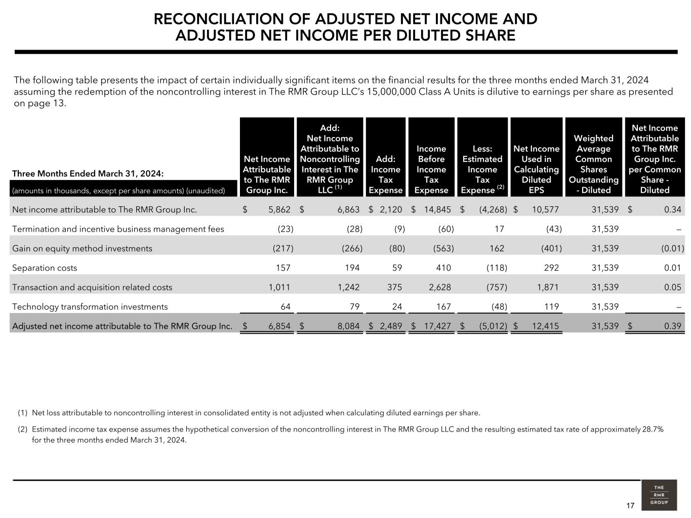 16 RECONCILIATION OF ADJUSTED NET INCOME AND ADJUSTED NET INCOME PER DILUTED SHARE Three Months Ended June 30, 2024: Net Income Attributable to The RMR Group Inc. Less: Income Attributable to Unvested Participating Securities Net Income Used in Calculating Diluted EPS Weighted Average Common Shares Outstanding - Diluted Net Income Attributable to The RMR Group Inc. per Common Share - Diluted(amounts in thousands, except per share amounts) (unaudited) Net income attributable to The RMR Group Inc. $ 4,935 $ (76) $ 4,859 16,542 $ 0.29 Termination and incentive business management fees (1) (139) 2 (137) 16,542 (0.01) Gain on equity method investments accounted for under the fair value option (2) (71) 1 (70) 16,542 — Separation costs (3) 291 (4) 287 16,542 0.02 Change in fair value of Earnout liability(4) (400) 6 (394) 16,542 (0.02) Uncertain tax position reserve, net of federal benefit(5) 1,234 (19) 1,215 16,542 0.07 Transaction and acquisition related costs (6) 344 (5) 339 16,542 0.02 Technology transformation investments (7) 62 (1) 61 16,542 — Adjusted net income attributable to The RMR Group Inc. $ 6,256 $ (96) $ 6,160 16,542 $ 0.37 The following table presents the impact of certain individually significant items on the financial results for the three months ended June 30, 2024, excluding the assumed redemption of the noncontrolling interest in The RMR Group LLC’s 15,000,000 Class A Units as such redemption is anti-dilutive to earnings per share as presented on page 13. (1) Includes $369 in termination and incentive business management fees earned, adjusted to reflect amounts attributable to the noncontrolling interest in The RMR Group LLC of $174 and income tax expense of $56 at a rate of approximately 15.1%. (2) Includes $188 in gains on The RMR Group Inc.’s investments in SEVN common shares, adjusted to reflect amounts attributable to the noncontrolling interest in The RMR Group LLC of $89 and income tax expense of $28 at a rate of approximately 15.1%. (3) Includes $771 of separation costs, adjusted to reflect amounts attributable to the noncontrolling interest in The RMR Group LLC of $364 and income tax expense of $116 at a rate of approximately 15.1%. (4) Includes $1,064 of change in fair value of Earnout liability, adjusted to reflect amounts attributable to the noncontrolling interest in The RMR Group LLC of $503 and income tax expense of $161 at a rate of approximately 15.1%. (5) Includes an adjustment of $1,562 related to a reserve for an uncertain tax position, net of federal tax benefit of $328 at a rate of 21.0%, which does not impact the noncontrolling interest in The RMR Group LLC. (6) Includes $915 of transaction and acquisition related costs, adjusted to reflect amounts attributable to the noncontrolling interest in The RMR Group LLC of $433 and income tax expense of $138 at a rate of approximately 15.1%. (7) Includes $165 of technology transformation investments included in general and administrative expenses, adjusted to reflect amounts attributable to the noncontrolling interest in The RMR Group LLC of $78 and income tax expense of $25 at a rate of approximately 15.1%.