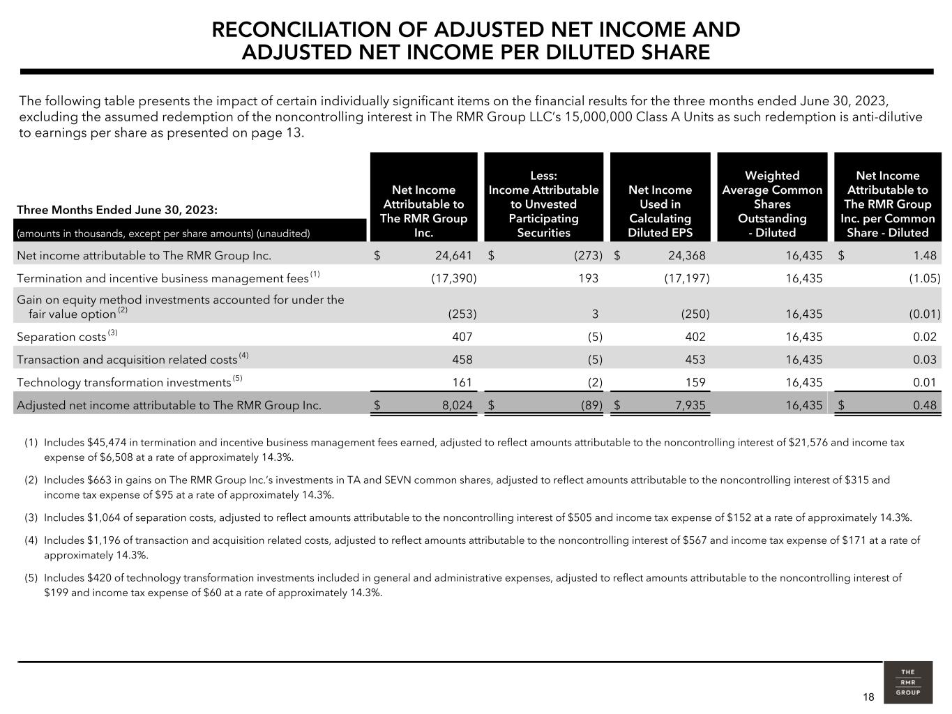 17 RECONCILIATION OF ADJUSTED NET INCOME AND ADJUSTED NET INCOME PER DILUTED SHARE The following table presents the impact of certain individually significant items on the financial results for the three months ended March 31, 2024 assuming the redemption of the noncontrolling interest in The RMR Group LLC’s 15,000,000 Class A Units is dilutive to earnings per share as presented on page 13. (1) Net loss attributable to noncontrolling interest in consolidated entity is not adjusted when calculating diluted earnings per share. (2) Estimated income tax expense assumes the hypothetical conversion of the noncontrolling interest in The RMR Group LLC and the resulting estimated tax rate of approximately 28.7% for the three months ended March 31, 2024. Three Months Ended March 31, 2024: Net Income Attributable to The RMR Group Inc. Add: Net Income Attributable to Noncontrolling Interest in The RMR Group LLC (1) Add: Income Tax Expense Income Before Income Tax Expense Less: Estimated Income Tax Expense (2) Net Income Used in Calculating Diluted EPS Weighted Average Common Shares Outstanding - Diluted Net Income Attributable to The RMR Group Inc. per Common Share - Diluted(amounts in thousands, except per share amounts) (unaudited) Net income attributable to The RMR Group Inc. $ 5,862 $ 6,863 $ 2,120 $ 14,845 $ (4,268) $ 10,577 31,539 $ 0.34 Termination and incentive business management fees (23) (28) (9) (60) 17 (43) 31,539 — Gain on equity method investments (217) (266) (80) (563) 162 (401) 31,539 (0.01) Separation costs 157 194 59 410 (118) 292 31,539 0.01 Transaction and acquisition related costs 1,011 1,242 375 2,628 (757) 1,871 31,539 0.05 Technology transformation investments 64 79 24 167 (48) 119 31,539 — Adjusted net income attributable to The RMR Group Inc. $ 6,854 $ 8,084 $ 2,489 $ 17,427 $ (5,012) $ 12,415 31,539 $ 0.39