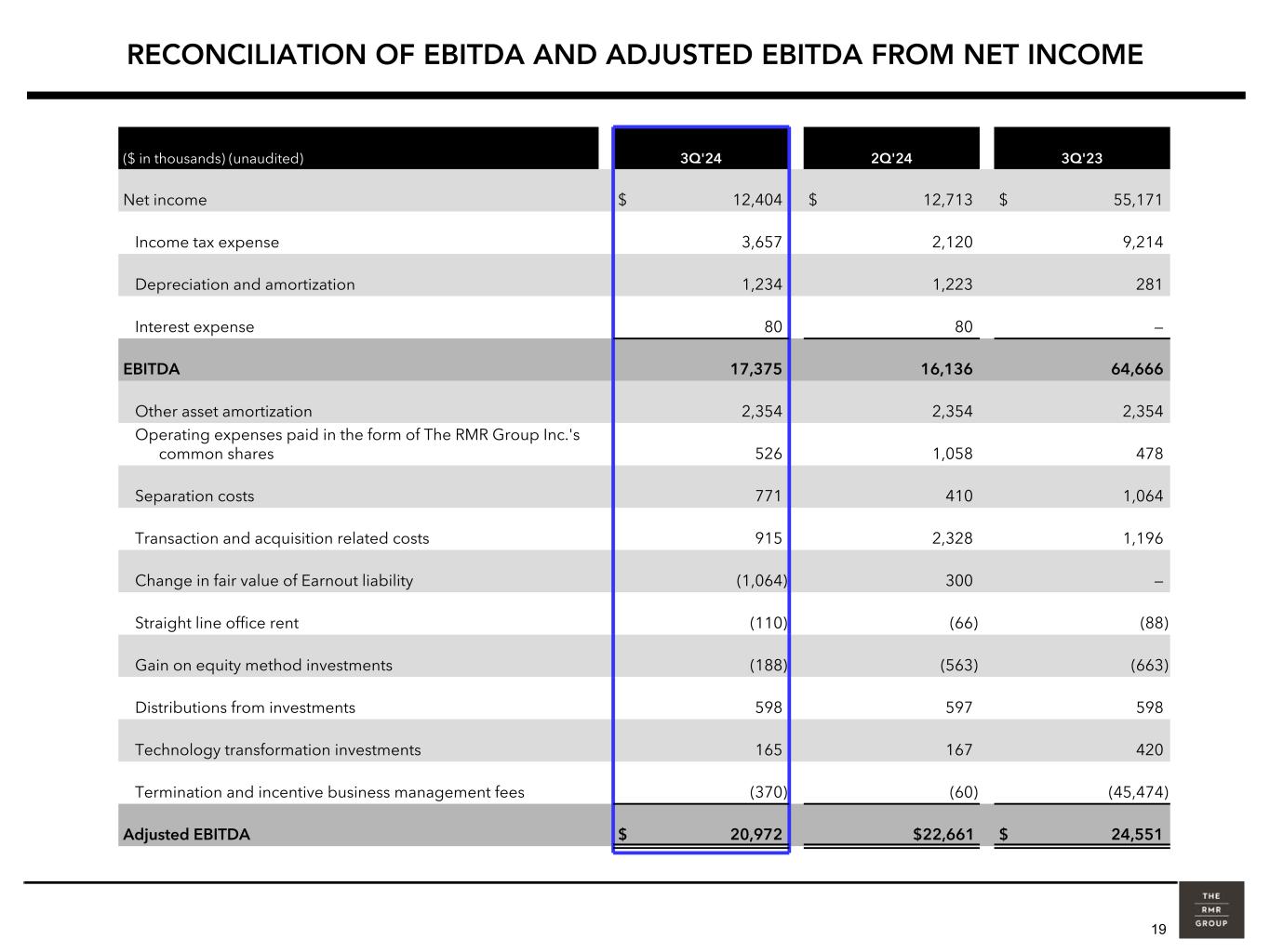 18 RECONCILIATION OF ADJUSTED NET INCOME AND ADJUSTED NET INCOME PER DILUTED SHARE Three Months Ended June 30, 2023: Net Income Attributable to The RMR Group Inc. Less: Income Attributable to Unvested Participating Securities Net Income Used in Calculating Diluted EPS Weighted Average Common Shares Outstanding - Diluted Net Income Attributable to The RMR Group Inc. per Common Share - Diluted(amounts in thousands, except per share amounts) (unaudited) Net income attributable to The RMR Group Inc. $ 24,641 $ (273) $ 24,368 16,435 $ 1.48 Termination and incentive business management fees (1) (17,390) 193 (17,197) 16,435 (1.05) Gain on equity method investments accounted for under the fair value option (2) (253) 3 (250) 16,435 (0.01) Separation costs (3) 407 (5) 402 16,435 0.02 Transaction and acquisition related costs (4) 458 (5) 453 16,435 0.03 Technology transformation investments (5) 161 (2) 159 16,435 0.01 Adjusted net income attributable to The RMR Group Inc. $ 8,024 $ (89) $ 7,935 16,435 $ 0.48 The following table presents the impact of certain individually significant items on the financial results for the three months ended June 30, 2023, excluding the assumed redemption of the noncontrolling interest in The RMR Group LLC’s 15,000,000 Class A Units as such redemption is anti-dilutive to earnings per share as presented on page 13. (1) Includes $45,474 in termination and incentive business management fees earned, adjusted to reflect amounts attributable to the noncontrolling interest of $21,576 and income tax expense of $6,508 at a rate of approximately 14.3%. (2) Includes $663 in gains on The RMR Group Inc.’s investments in TA and SEVN common shares, adjusted to reflect amounts attributable to the noncontrolling interest of $315 and income tax expense of $95 at a rate of approximately 14.3%. (3) Includes $1,064 of separation costs, adjusted to reflect amounts attributable to the noncontrolling interest of $505 and income tax expense of $152 at a rate of approximately 14.3%. (4) Includes $1,196 of transaction and acquisition related costs, adjusted to reflect amounts attributable to the noncontrolling interest of $567 and income tax expense of $171 at a rate of approximately 14.3%. (5) Includes $420 of technology transformation investments included in general and administrative expenses, adjusted to reflect amounts attributable to the noncontrolling interest of $199 and income tax expense of $60 at a rate of approximately 14.3%.