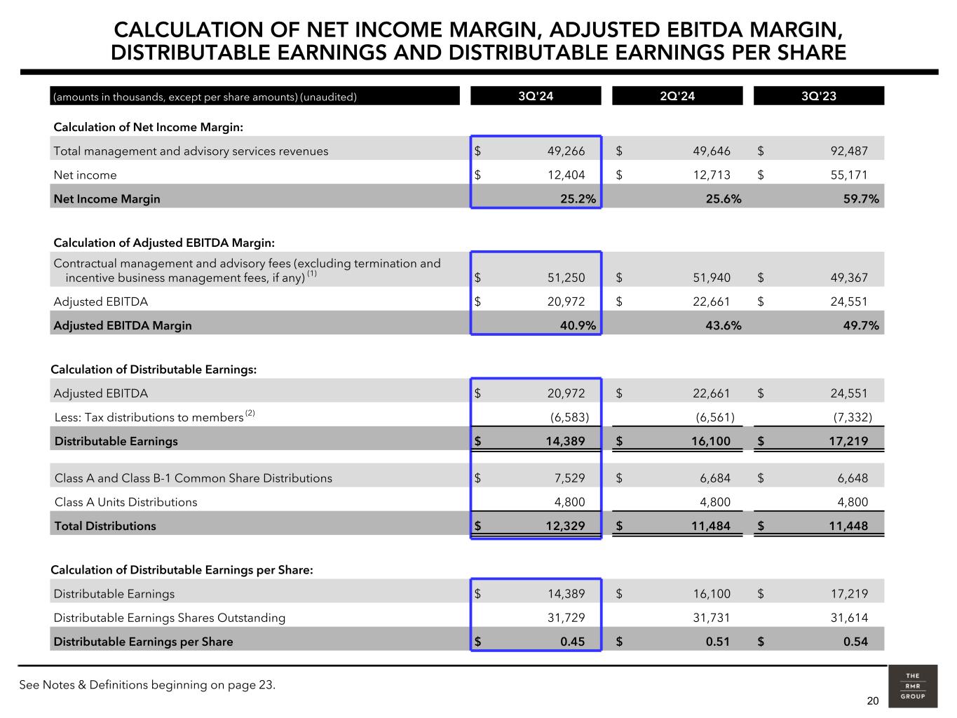 20 CALCULATION OF NET INCOME MARGIN, ADJUSTED EBITDA MARGIN, DISTRIBUTABLE EARNINGS AND DISTRIBUTABLE EARNINGS PER SHARE (amounts in thousands, except per share amounts) (unaudited) 3Q'24 2Q'24 3Q'23 Calculation of Net Income Margin: Total management and advisory services revenues $ 49,266 $ 49,646 $ 92,487 Net income $ 12,404 $ 12,713 $ 55,171 Net Income Margin 25.2% 25.6% 59.7% Calculation of Adjusted EBITDA Margin: Contractual management and advisory fees (excluding termination and incentive business management fees, if any) (1) $ 51,250 $ 51,940 $ 49,367 Adjusted EBITDA $ 20,972 $ 22,661 $ 24,551 Adjusted EBITDA Margin 40.9% 43.6% 49.7% Calculation of Distributable Earnings: Adjusted EBITDA $ 20,972 $ 22,661 $ 24,551 Less: Tax distributions to members (2) (6,583) (6,561) (7,332) Distributable Earnings $ 14,389 $ 16,100 $ 17,219 Class A and Class B-1 Common Share Distributions $ 7,529 $ 6,684 $ 6,648 Class A Units Distributions 4,800 4,800 4,800 Total Distributions $ 12,329 $ 11,484 $ 11,448 Calculation of Distributable Earnings per Share: Distributable Earnings $ 14,389 $ 16,100 $ 17,219 Distributable Earnings Shares Outstanding 31,729 31,731 31,614 Distributable Earnings per Share $ 0.45 $ 0.51 $ 0.54 See Notes & Definitions beginning on page 23.