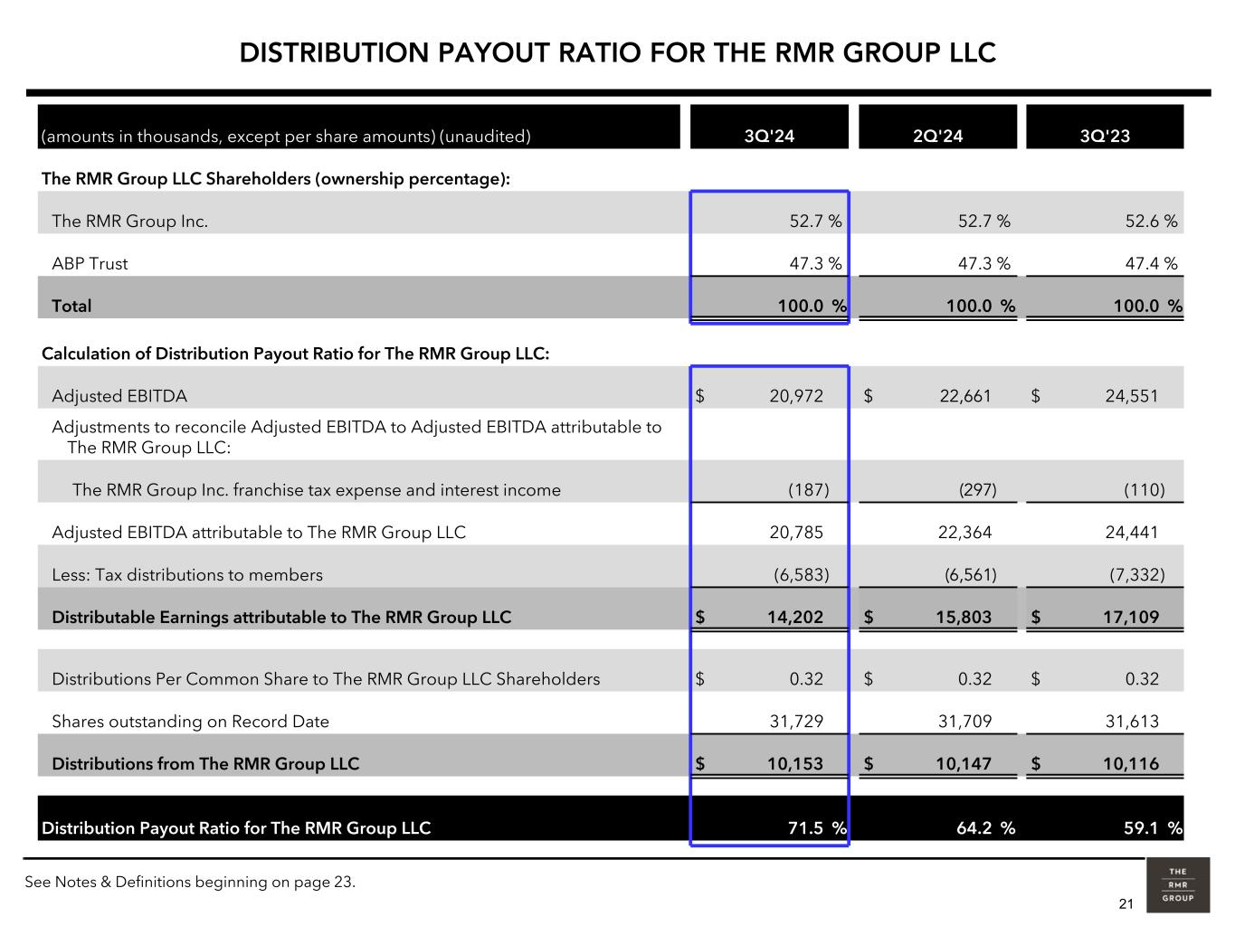 21 DISTRIBUTION PAYOUT RATIO FOR THE RMR GROUP LLC (amounts in thousands, except per share amounts) (unaudited) 3Q'24 2Q'24 3Q'23 The RMR Group LLC Shareholders (ownership percentage): The RMR Group Inc. 52.7 % 52.7 % 52.6 % ABP Trust 47.3 % 47.3 % 47.4 % Total 100.0 % 100.0 % 100.0 % Calculation of Distribution Payout Ratio for The RMR Group LLC: Adjusted EBITDA $ 20,972 $ 22,661 $ 24,551 Adjustments to reconcile Adjusted EBITDA to Adjusted EBITDA attributable to The RMR Group LLC: The RMR Group Inc. franchise tax expense and interest income (187) (297) (110) Adjusted EBITDA attributable to The RMR Group LLC 20,785 22,364 24,441 Less: Tax distributions to members (6,583) (6,561) (7,332) Distributable Earnings attributable to The RMR Group LLC $ 14,202 $ 15,803 $ 17,109 Distributions Per Common Share to The RMR Group LLC Shareholders $ 0.32 $ 0.32 $ 0.32 Shares outstanding on Record Date 31,729 31,709 31,613 Distributions from The RMR Group LLC $ 10,153 $ 10,147 $ 10,116 Distribution Payout Ratio for The RMR Group LLC 71.5 % 64.2 % 59.1 % See Notes & Definitions beginning on page 23.