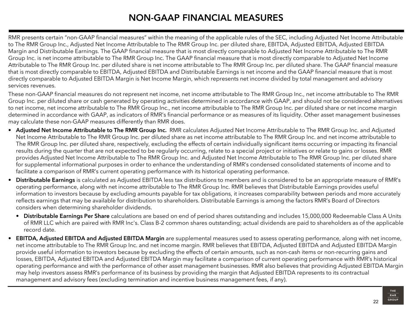 22 RMR presents certain “non-GAAP financial measures” within the meaning of the applicable rules of the SEC, including Adjusted Net Income Attributable to The RMR Group Inc., Adjusted Net Income Attributable to The RMR Group Inc. per diluted share, EBITDA, Adjusted EBITDA, Adjusted EBITDA Margin and Distributable Earnings. The GAAP financial measure that is most directly comparable to Adjusted Net Income Attributable to The RMR Group Inc. is net income attributable to The RMR Group Inc. The GAAP financial measure that is most directly comparable to Adjusted Net Income Attributable to The RMR Group Inc. per diluted share is net income attributable to The RMR Group Inc. per diluted share. The GAAP financial measure that is most directly comparable to EBITDA, Adjusted EBITDA and Distributable Earnings is net income and the GAAP financial measure that is most directly comparable to Adjusted EBITDA Margin is Net Income Margin, which represents net income divided by total management and advisory services revenues. These non-GAAP financial measures do not represent net income, net income attributable to The RMR Group Inc., net income attributable to The RMR Group Inc. per diluted share or cash generated by operating activities determined in accordance with GAAP, and should not be considered alternatives to net income, net income attributable to The RMR Group Inc., net income attributable to The RMR Group Inc. per diluted share or net income margin determined in accordance with GAAP, as indicators of RMR’s financial performance or as measures of its liquidity. Other asset management businesses may calculate these non-GAAP measures differently than RMR does. • Adjusted Net Income Attributable to The RMR Group Inc. RMR calculates Adjusted Net Income Attributable to The RMR Group Inc. and Adjusted Net Income Attributable to The RMR Group Inc. per diluted share as net income attributable to The RMR Group Inc. and net income attributable to The RMR Group Inc. per diluted share, respectively, excluding the effects of certain individually significant items occurring or impacting its financial results during the quarter that are not expected to be regularly occurring, relate to a special project or initiatives or relate to gains or losses. RMR provides Adjusted Net Income Attributable to The RMR Group Inc. and Adjusted Net Income Attributable to The RMR Group Inc. per diluted share for supplemental informational purposes in order to enhance the understanding of RMR’s condensed consolidated statements of income and to facilitate a comparison of RMR’s current operating performance with its historical operating performance. • Distributable Earnings is calculated as Adjusted EBITDA less tax distributions to members and is considered to be an appropriate measure of RMR’s operating performance, along with net income attributable to The RMR Group Inc. RMR believes that Distributable Earnings provides useful information to investors because by excluding amounts payable for tax obligations, it increases comparability between periods and more accurately reflects earnings that may be available for distribution to shareholders. Distributable Earnings is among the factors RMR’s Board of Directors considers when determining shareholder dividends. • Distributable Earnings Per Share calculations are based on end of period shares outstanding and includes 15,000,000 Redeemable Class A Units of RMR LLC which are paired with RMR Inc's. Class B-2 common shares outstanding; actual dividends are paid to shareholders as of the applicable record date. • EBITDA, Adjusted EBITDA and Adjusted EBITDA Margin are supplemental measures used to assess operating performance, along with net income, net income attributable to The RMR Group Inc. and net income margin. RMR believes that EBITDA, Adjusted EBITDA and Adjusted EBITDA Margin provide useful information to investors because by excluding the effects of certain amounts, such as non-cash items or non-recurring gains and losses, EBITDA, Adjusted EBITDA and Adjusted EBITDA Margin may facilitate a comparison of current operating performance with RMR’s historical operating performance and with the performance of other asset management businesses. RMR also believes that providing Adjusted EBITDA Margin may help investors assess RMR’s performance of its business by providing the margin that Adjusted EBITDA represents to its contractual management and advisory fees (excluding termination and incentive business management fees, if any). NON-GAAP FINANCIAL MEASURES