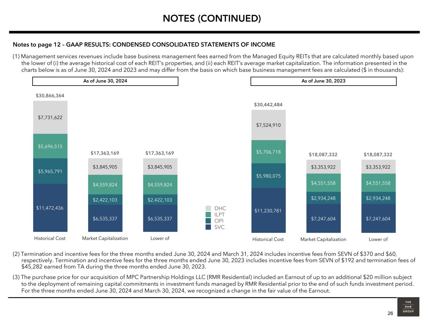 26 $30,442,484 $18,087,332 $18,087,332 $11,230,781 $7,247,604 $7,247,604 $5,980,075 $2,934,248 $2,934,248 $5,706,718 $4,551,558 $4,551,558 $7,524,910 $3,353,922 $3,353,922 Historical Cost Market Capitalization Lower of $30,866,364 $17,363,169 $17,363,169 $11,472,436 $6,535,337 $6,535,337 $5,965,791 $2,422,103 $2,422,103 $5,696,515 $4,559,824 $4,559,824 $7,731,622 $3,845,905 $3,845,905 Historical Cost Market Capitalization Lower of 0 DHC ILPT OPI SVC NOTES (CONTINUED) As of June 30, 2024 As of June 30, 2023 Notes to page 12 – GAAP RESULTS: CONDENSED CONSOLIDATED STATEMENTS OF INCOME (1) Management services revenues include base business management fees earned from the Managed Equity REITs that are calculated monthly based upon the lower of (i) the average historical cost of each REIT’s properties, and (ii) each REIT’s average market capitalization. The information presented in the charts below is as of June 30, 2024 and 2023 and may differ from the basis on which base business management fees are calculated ($ in thousands): (2) Termination and incentive fees for the three months ended June 30, 2024 and March 31, 2024 includes incentive fees from SEVN of $370 and $60, respectively. Termination and incentive fees for the three months ended June 30, 2023 includes incentive fees from SEVN of $192 and termination fees of $45,282 earned from TA during the three months ended June 30, 2023. (3) The purchase price for our acquisition of MPC Partnership Holdings LLC (RMR Residential) included an Earnout of up to an additional $20 million subject to the deployment of remaining capital commitments in investment funds managed by RMR Residential prior to the end of such funds investment period. For the three months ended June 30, 2024 and March 30, 2024, we recognized a change in the fair value of the Earnout.