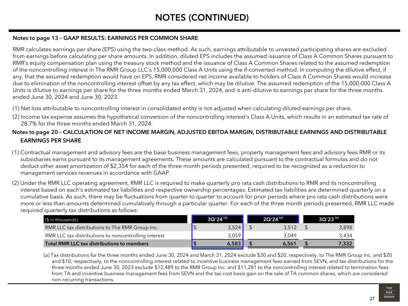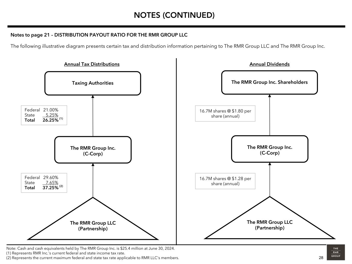 27 Notes to page 20 – CALCULATION OF NET INCOME MARGIN, ADJUSTED EBITDA MARGIN, DISTRIBUTABLE EARNINGS AND DISTRIBUTABLE EARNINGS PER SHARE (1) Contractual management and advisory fees are the base business management fees, property management fees and advisory fees RMR or its subsidiaries earns pursuant to its management agreements. These amounts are calculated pursuant to the contractual formulas and do not deduct other asset amortization of $2,354 for each of the three month periods presented, required to be recognized as a reduction to management services revenues in accordance with GAAP. (2) Under the RMR LLC operating agreement, RMR LLC is required to make quarterly pro rata cash distributions to RMR and its noncontrolling interest based on each’s estimated tax liabilities and respective ownership percentages. Estimated tax liabilities are determined quarterly on a cumulative basis. As such, there may be fluctuations from quarter to quarter to account for prior periods where pro rata cash distributions were more or less than amounts determined cumulatively through a particular quarter. For each of the three month periods presented, RMR LLC made required quarterly tax distributions as follows: NOTES (CONTINUED) Notes to page 13 – GAAP RESULTS: EARNINGS PER COMMON SHARE RMR calculates earnings per share (EPS) using the two-class method. As such, earnings attributable to unvested participating shares are excluded from earnings before calculating per share amounts. In addition, diluted EPS includes the assumed issuance of Class A Common Shares pursuant to RMR’s equity compensation plan using the treasury stock method and the issuance of Class A Common Shares related to the assumed redemption of the noncontrolling interest in The RMR Group LLC’s 15,000,000 Class A Units using the if-converted method. In computing the dilutive effect, if any, that the assumed redemption would have on EPS, RMR considered net income available to holders of Class A Common Shares would increase due to elimination of the noncontrolling interest offset by any tax effect, which may be dilutive. The assumed redemption of the 15,000,000 Class A Units is dilutive to earnings per share for the three months ended March 31, 2024, and is anti-dilutive to earnings per share for the three months ended June 30, 2024 and June 30, 2023. (1) Net loss attributable to noncontrolling interest in consolidated entity is not adjusted when calculating diluted earnings per share. (2) Income tax expense assumes the hypothetical conversion of the noncontrolling interest's Class A Units, which results in an estimated tax rate of 28.7% for the three months ended March 31, 2024. (a) Tax distributions for the three months ended June 30, 2024 and March 31, 2024 exclude $30 and $20, respectively, to The RMR Group Inc. and $20 and $10, respectively, to the noncontrolling interest related to incentive business management fees earned from SEVN, and tax distributions for the three months ended June 30, 2023 exclude $12,489 to the RMR Group Inc. and $11,281 to the noncontrolling interest related to termination fees from TA and incentive business management fees from SEVN and the tax cost basis gain on the sale of TA common shares, which are considered non-recurring transactions. ($ in thousands) 3Q'24 (a) 2Q'24 (a) 3Q'23 (a) RMR LLC tax distributions to The RMR Group Inc. $ 3,524 $ 3,512 $ 3,898 RMR LLC tax distributions to noncontrolling interest 3,059 3,049 3,434 Total RMR LLC tax distributions to members $ 6,583 $ 6,561 $ 7,332