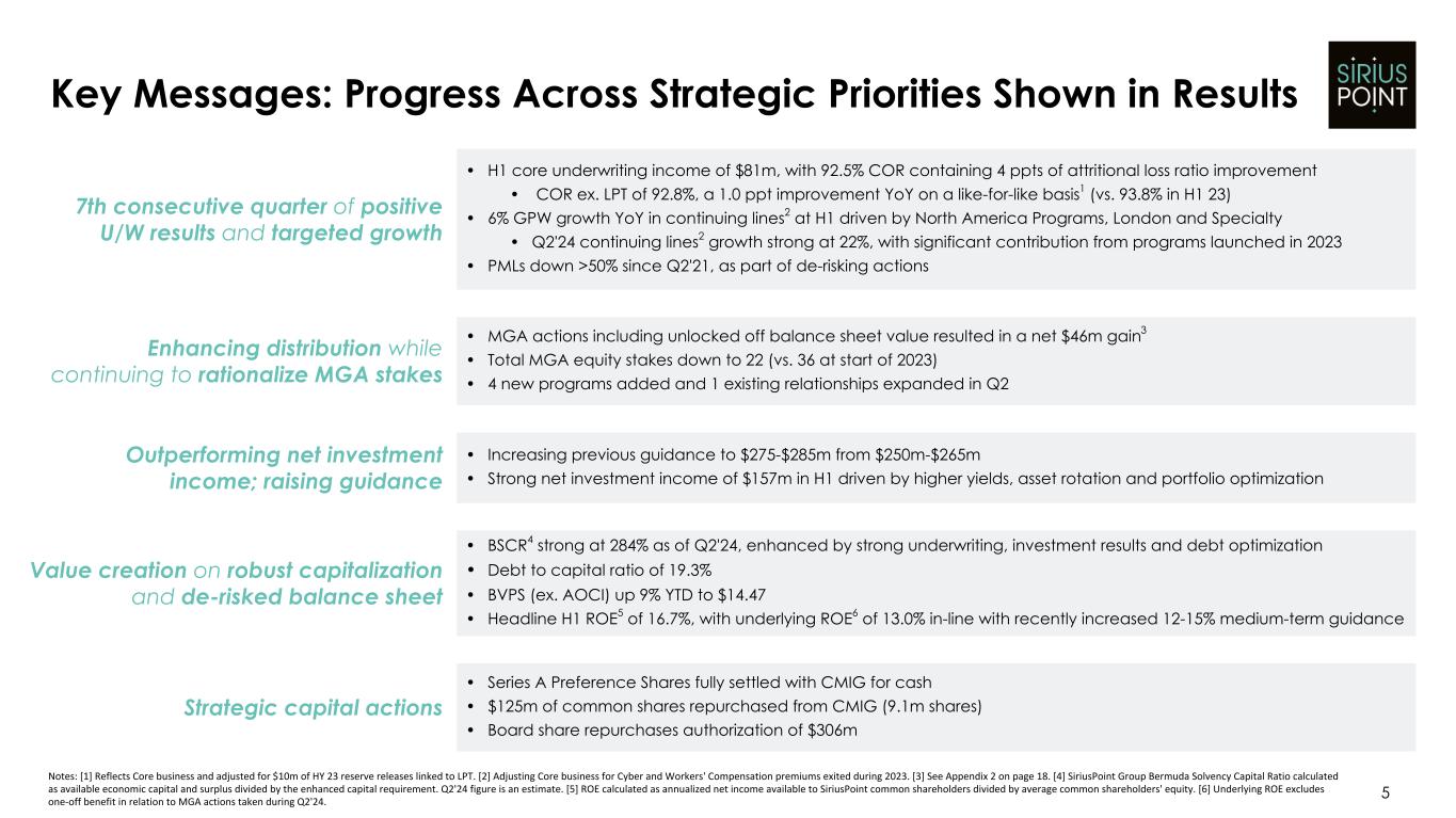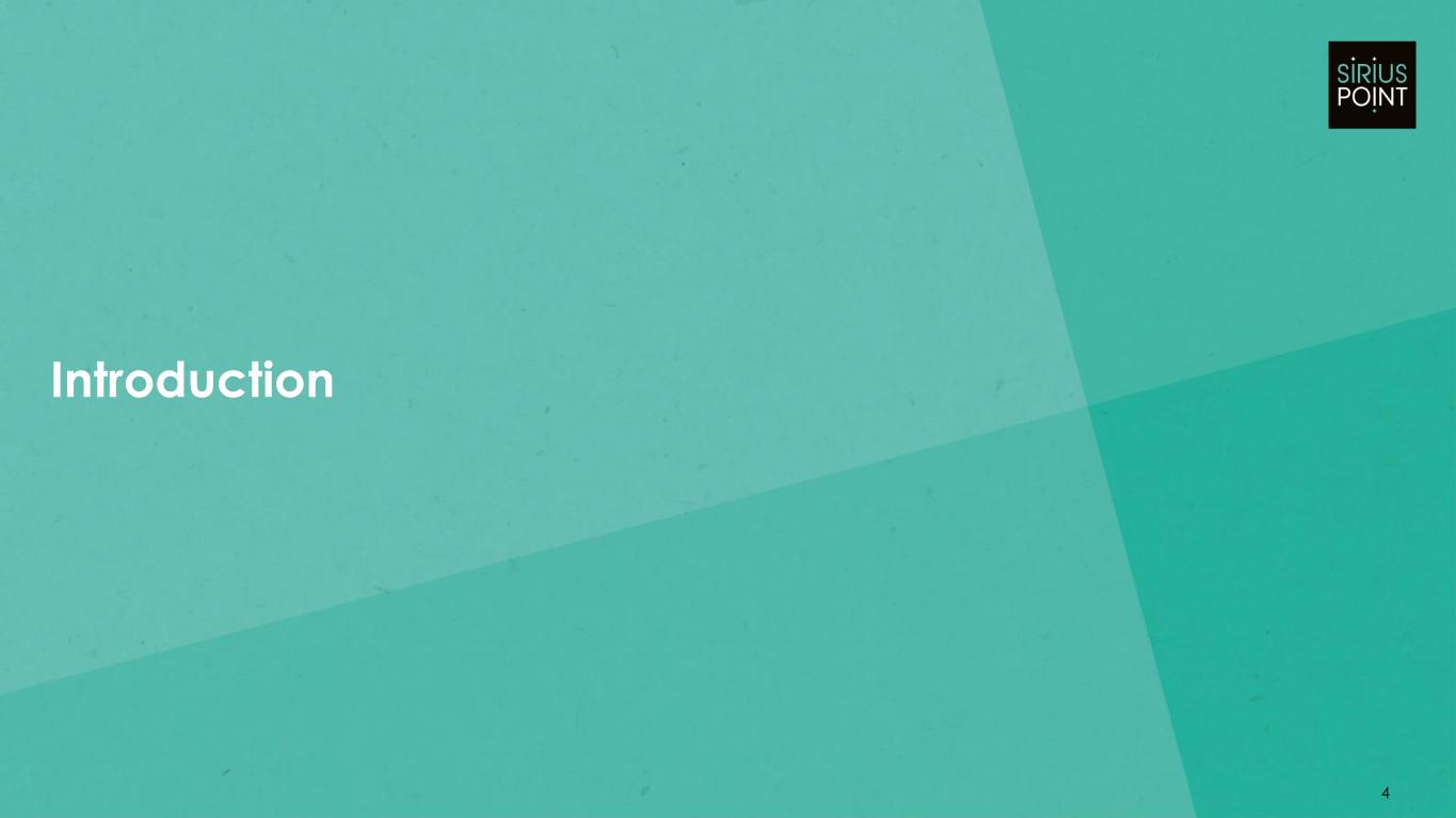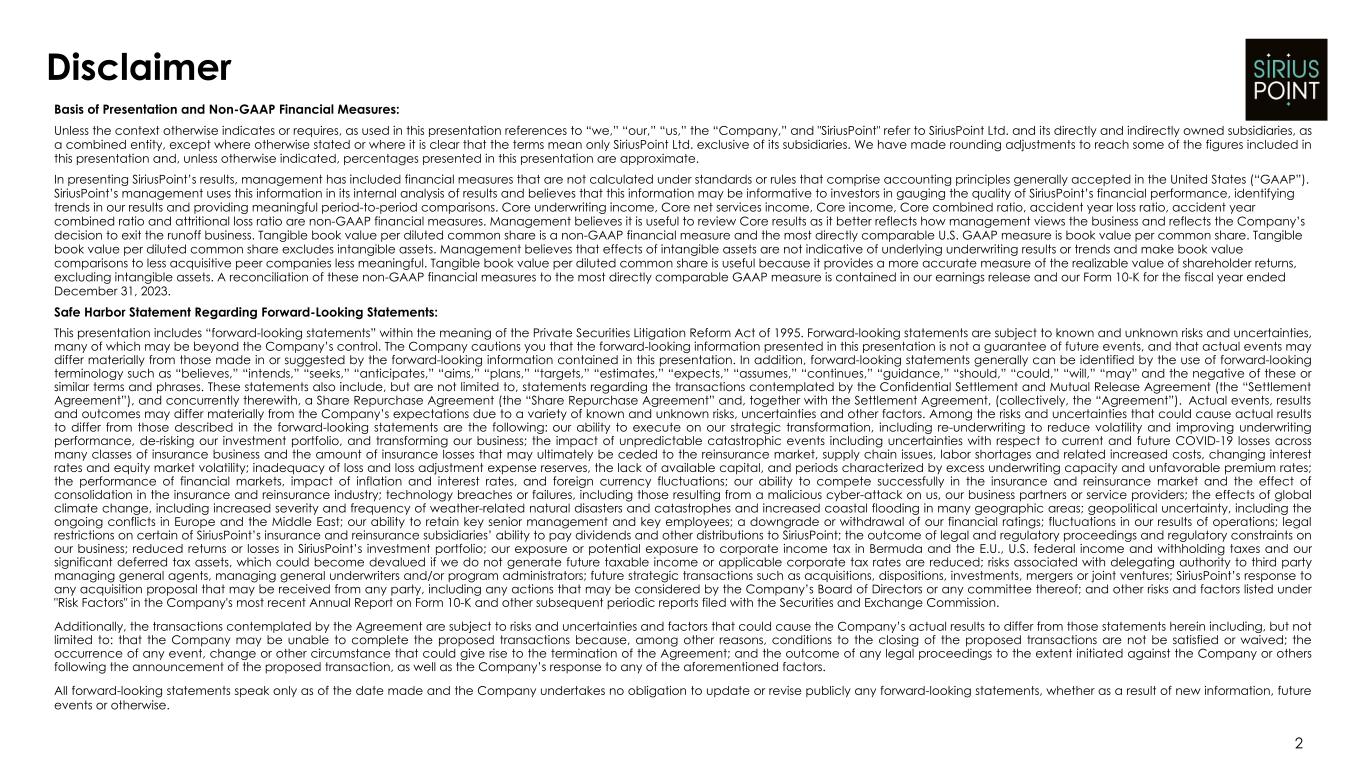 Basis of Presentation and Non-GAAP Financial Measures: Unless the context otherwise indicates or requires, as used in this presentation references to “we,” “our,” “us,” the “Company,” and "SiriusPoint" refer to SiriusPoint Ltd. and its directly and indirectly owned subsidiaries, as a combined entity, except where otherwise stated or where it is clear that the terms mean only SiriusPoint Ltd. exclusive of its subsidiaries. We have made rounding adjustments to reach some of the figures included in this presentation and, unless otherwise indicated, percentages presented in this presentation are approximate. In presenting SiriusPoint’s results, management has included financial measures that are not calculated under standards or rules that comprise accounting principles generally accepted in the United States (“GAAP”). SiriusPoint’s management uses this information in its internal analysis of results and believes that this information may be informative to investors in gauging the quality of SiriusPoint’s financial performance, identifying trends in our results and providing meaningful period-to-period comparisons. Core underwriting income, Core net services income, Core income, Core combined ratio, accident year loss ratio, accident year combined ratio and attritional loss ratio are non-GAAP financial measures. Management believes it is useful to review Core results as it better reflects how management views the business and reflects the Company’s decision to exit the runoff business. Tangible book value per diluted common share is a non-GAAP financial measure and the most directly comparable U.S. GAAP measure is book value per common share. Tangible book value per diluted common share excludes intangible assets. Management believes that effects of intangible assets are not indicative of underlying underwriting results or trends and make book value comparisons to less acquisitive peer companies less meaningful. Tangible book value per diluted common share is useful because it provides a more accurate measure of the realizable value of shareholder returns, excluding intangible assets. A reconciliation of these non-GAAP financial measures to the most directly comparable GAAP measure is contained in our earnings release and our Form 10-K for the fiscal year ended December 31, 2023. Safe Harbor Statement Regarding Forward-Looking Statements: This presentation includes “forward-looking statements” within the meaning of the Private Securities Litigation Reform Act of 1995. Forward-looking statements are subject to known and unknown risks and uncertainties, many of which may be beyond the Company’s control. The Company cautions you that the forward-looking information presented in this presentation is not a guarantee of future events, and that actual events may differ materially from those made in or suggested by the forward-looking information contained in this presentation. In addition, forward-looking statements generally can be identified by the use of forward-looking terminology such as “believes,” “intends,” “seeks,” “anticipates,” “aims,” “plans,” “targets,” “estimates,” “expects,” “assumes,” “continues,” “guidance,” “should,” “could,” “will,” “may” and the negative of these or similar terms and phrases. These statements also include, but are not limited to, statements regarding the transactions contemplated by the Confidential Settlement and Mutual Release Agreement (the “Settlement Agreement”), and concurrently therewith, a Share Repurchase Agreement (the “Share Repurchase Agreement” and, together with the Settlement Agreement, (collectively, the “Agreement”). Actual events, results and outcomes may differ materially from the Company’s expectations due to a variety of known and unknown risks, uncertainties and other factors. Among the risks and uncertainties that could cause actual results to differ from those described in the forward-looking statements are the following: our ability to execute on our strategic transformation, including re-underwriting to reduce volatility and improving underwriting performance, de-risking our investment portfolio, and transforming our business; the impact of unpredictable catastrophic events including uncertainties with respect to current and future COVID-19 losses across many classes of insurance business and the amount of insurance losses that may ultimately be ceded to the reinsurance market, supply chain issues, labor shortages and related increased costs, changing interest rates and equity market volatility; inadequacy of loss and loss adjustment expense reserves, the lack of available capital, and periods characterized by excess underwriting capacity and unfavorable premium rates; the performance of financial markets, impact of inflation and interest rates, and foreign currency fluctuations; our ability to compete successfully in the insurance and reinsurance market and the effect of consolidation in the insurance and reinsurance industry; technology breaches or failures, including those resulting from a malicious cyber-attack on us, our business partners or service providers; the effects of global climate change, including increased severity and frequency of weather-related natural disasters and catastrophes and increased coastal flooding in many geographic areas; geopolitical uncertainty, including the ongoing conflicts in Europe and the Middle East; our ability to retain key senior management and key employees; a downgrade or withdrawal of our financial ratings; fluctuations in our results of operations; legal restrictions on certain of SiriusPoint’s insurance and reinsurance subsidiaries’ ability to pay dividends and other distributions to SiriusPoint; the outcome of legal and regulatory proceedings and regulatory constraints on our business; reduced returns or losses in SiriusPoint’s investment portfolio; our exposure or potent