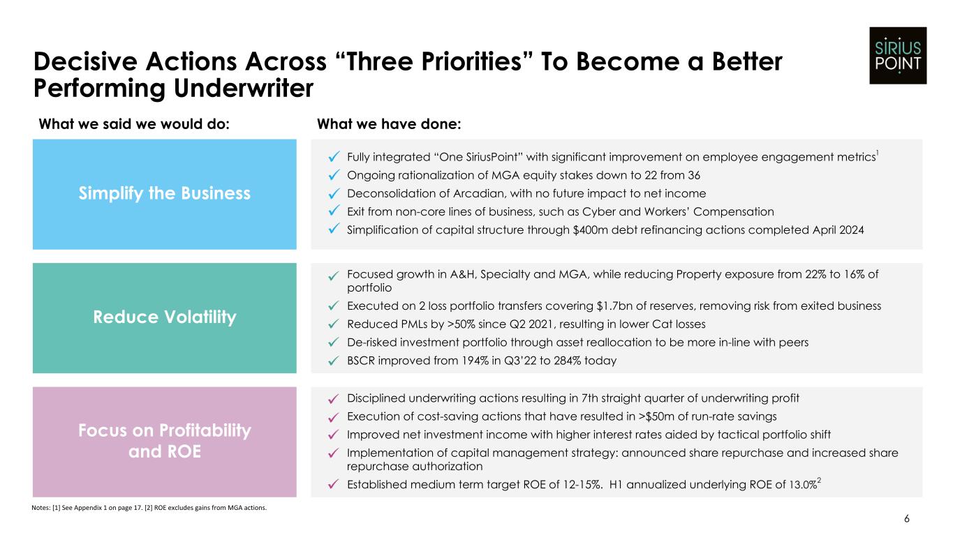 5 Key Messages: Progress Across Strategic Priorities Shown in Results Notes: [1] Reflects Core business and adjusted for $10m of HY 23 reserve releases linked to LPT. [2] Adjusting Core business for Cyber and Workers' Compensation premiums exited during 2023. [3] See Appendix 2 on page 18. [4] SiriusPoint Group Bermuda Solvency Capital Ratio calculated as available economic capital and surplus divided by the enhanced capital requirement. Q2'24 figure is an estimate. [5] ROE calculated as annualized net income available to SiriusPoint common shareholders divided by average common shareholders' equity. [6] Underlying ROE excludes one-off benefit in relation to MGA actions taken during Q2'24. Strategic capital actions Outperforming net investment income; raising guidance 7th consecutive quarter of positive U/W results and targeted growth • H1 core underwriting income of $81m, with 92.5% COR containing 4 ppts of attritional loss ratio improvement • COR ex. LPT of 92.8%, a 1.0 ppt improvement YoY on a like-for-like basis1 (vs. 93.8% in H1 23) • 6% GPW growth YoY in continuing lines2 at H1 driven by North America Programs, London and Specialty • Q2'24 continuing lines2 growth strong at 22%, with significant contribution from programs launched in 2023 • PMLs down >50% since Q2'21, as part of de-risking actions • Increasing previous guidance to $275-$285m from $250m-$265m • Strong net investment income of $157m in H1 driven by higher yields, asset rotation and portfolio optimization • Series A Preference Shares fully settled with CMIG for cash • $125m of common shares repurchased from CMIG (9.1m shares) • Board share repurchases authorization of $306m • BSCR4 strong at 284% as of Q2'24, enhanced by strong underwriting, investment results and debt optimization • Debt to capital ratio of 19.3% • BVPS (ex. AOCI) up 9% YTD to $14.47 • Headline H1 ROE5 of 16.7%, with underlying ROE6 of 13.0% in-line with recently increased 12-15% medium-term guidance Enhancing distribution while continuing to rationalize MGA stakes • MGA actions including unlocked off balance sheet value resulted in a net $46m gain3 • Total MGA equity stakes down to 22 (vs. 36 at start of 2023) • 4 new programs added and 1 existing relationships expanded in Q2 Value creation on robust capitalization and de-risked balance sheet