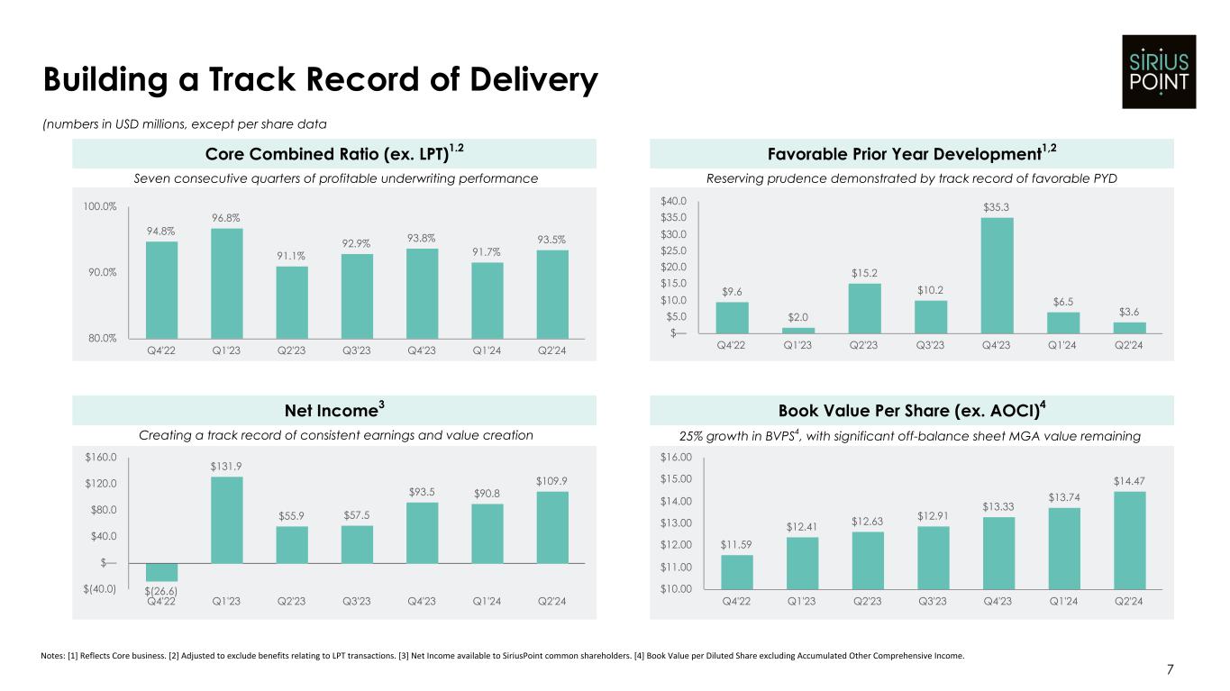 6 Decisive Actions Across “Three Priorities” To Become a Better Performing Underwriter Simplify the Business Reduce Volatility Focus on Profitability and ROE What we said we would do: What we have done: Fully integrated “One SiriusPoint” with significant improvement on employee engagement metrics1 Ongoing rationalization of MGA equity stakes down to 22 from 36 Deconsolidation of Arcadian, with no future impact to net income Exit from non-core lines of business, such as Cyber and Workers’ Compensation Simplification of capital structure through $400m debt refinancing actions completed April 2024 Focused growth in A&H, Specialty and MGA, while reducing Property exposure from 22% to 16% of portfolio Executed on 2 loss portfolio transfers covering $1.7bn of reserves, removing risk from exited business Reduced PMLs by >50% since Q2 2021, resulting in lower Cat losses De-risked investment portfolio through asset reallocation to be more in-line with peers BSCR improved from 194% in Q3’22 to 284% today Disciplined underwriting actions resulting in 7th straight quarter of underwriting profit Execution of cost-saving actions that have resulted in >$50m of run-rate savings Improved net investment income with higher interest rates aided by tactical portfolio shift Implementation of capital management strategy: announced share repurchase and increased share repurchase authorization Established medium term target ROE of 12-15%. H1 annualized underlying ROE of 13.0%2 Notes: [1] See Appendix 1 on page 17. [2] ROE excludes gains from MGA actions.