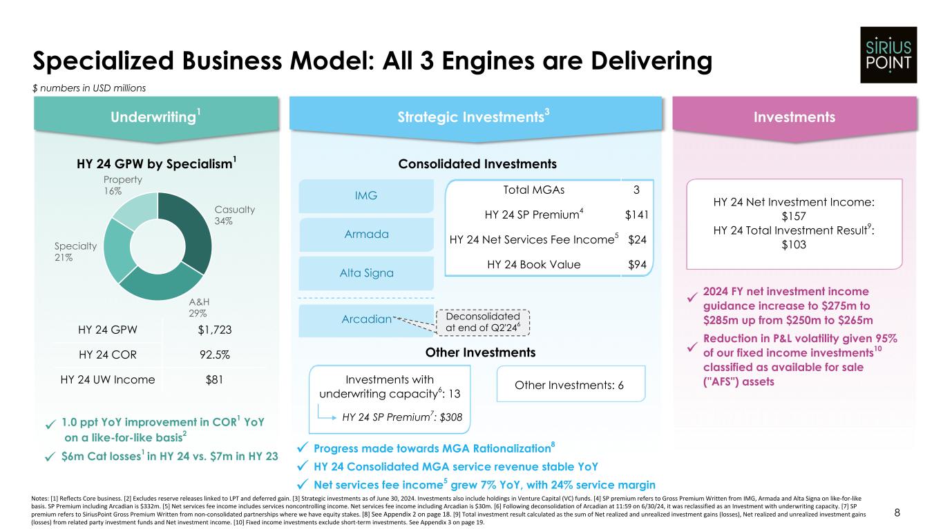 7 Building a Track Record of Delivery Notes: [1] Reflects Core business. [2] Adjusted to exclude benefits relating to LPT transactions. [3] Net Income available to SiriusPoint common shareholders. [4] Book Value per Diluted Share excluding Accumulated Other Comprehensive Income. Core Combined Ratio (ex. LPT)1.2 Net Income3 Book Value Per Share (ex. AOCI)4 Favorable Prior Year Development1,2 $9.6 $2.0 $15.2 $10.2 $35.3 $6.5 $3.6 Q4'22 Q1'23 Q2'23 Q3'23 Q4'23 Q1'24 Q2'24 $— $5.0 $10.0 $15.0 $20.0 $25.0 $30.0 $35.0 $40.0 $(26.6) $131.9 $55.9 $57.5 $93.5 $90.8 $109.9 Q4'22 Q1'23 Q2'23 Q3'23 Q4'23 Q1'24 Q2'24 $(40.0) $— $40.0 $80.0 $120.0 $160.0 $11.59 $12.41 $12.63 $12.91 $13.33 $13.74 $14.47 Q4'22 Q1'23 Q2'23 Q3'23 Q4'23 Q1'24 Q2'24 $10.00 $11.00 $12.00 $13.00 $14.00 $15.00 $16.00 94.8% 96.8% 91.1% 92.9% 93.8% 91.7% 93.5% Q4'22 Q1'23 Q2'23 Q3'23 Q4'23 Q1'24 Q2'24 80.0% 90.0% 100.0% Seven consecutive quarters of profitable underwriting performance Reserving prudence demonstrated by track record of favorable PYD Creating a track record of consistent earnings and value creation 25% growth in BVPS4, with significant off-balance sheet MGA value remaining (numbers in USD millions, except per share data