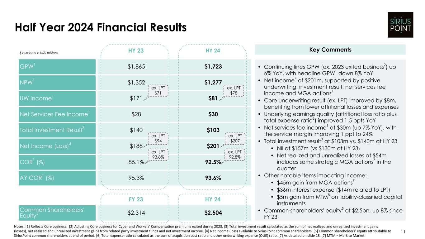 $ numbers in USD millions Q2'23 Q2'24 GPW1 $805 $843 NPW1 $588 $650 UW Income1 $63 $37 Net Services Fee Income1 $9 $10 Total Investment Result3 $66 $23 Net Income (Loss)4 $56 $110 COR1 (%) 89.4% 93.3% AY COR1 (%) 93.6% 94.2% Q1'24 Q2'24 Common Shareholders' Equity5 $2,403 $2,504 Q2 2024 Financial Results 10 Notes: [1] Reflects Core business. [2] Adjusting Core business for Cyber and Workers' Compensation premiums exited during 2023. [3] Total investment result calculated as the sum of net realized and unrealized investment gains (losses), net realized and unrealized investment gains from related party investment funds and net investment income. [4] Net income (loss) available to SiriusPoint common shareholders. [5] Common shareholders’ equity attributable to SiriusPoint common shareholders at end of period. [6] Total expense ratio calculated as the sum of acquisition cost ratio and other underwriting expense (OUE) ratio. [7] As detailed on slide 18. [8] MTM = Mark to Market. • Continuing lines GPW (ex. 2023 exited business2) up 22% YoY, with headline GPW1 up 5% YoY • Net income4 of $110m, or $114m (ex. LPT) up 97% YoY • Core underwriting result (ex. LPT) decreased by $18m YoY driven by lower favorable PYD ($12m) and higher cat losses ($6m) • Underlying earnings quality (attritional loss ratio plus total expense ratio6) improved 0.4 ppts YoY • Net services fee income1 grew 3% to $10m, with the service margin increasing 1 ppt to 17% • Total investment result3 at $23m vs. $66m in Q2'23. • NII at $78m vs. $69m in Q2'23 • Net realized and unrealized losses includes some strategic MGA actions7 in the quarter • Other notable items impacting Q2'24 income: • $46m net gain from MGA actions7 • $16m interest expense of which $7m relates to LPT • $11m gain from MTM8 on liability-classified capital instruments • Common shareholders' equity5 at $2.5bn, up 4% in the quarter Key Comments ex. LPT $53 ex. LPT 91.1% ex. LPT $43 ex. LPT $36 ex. LPT $114 ex. LPT 93.5%