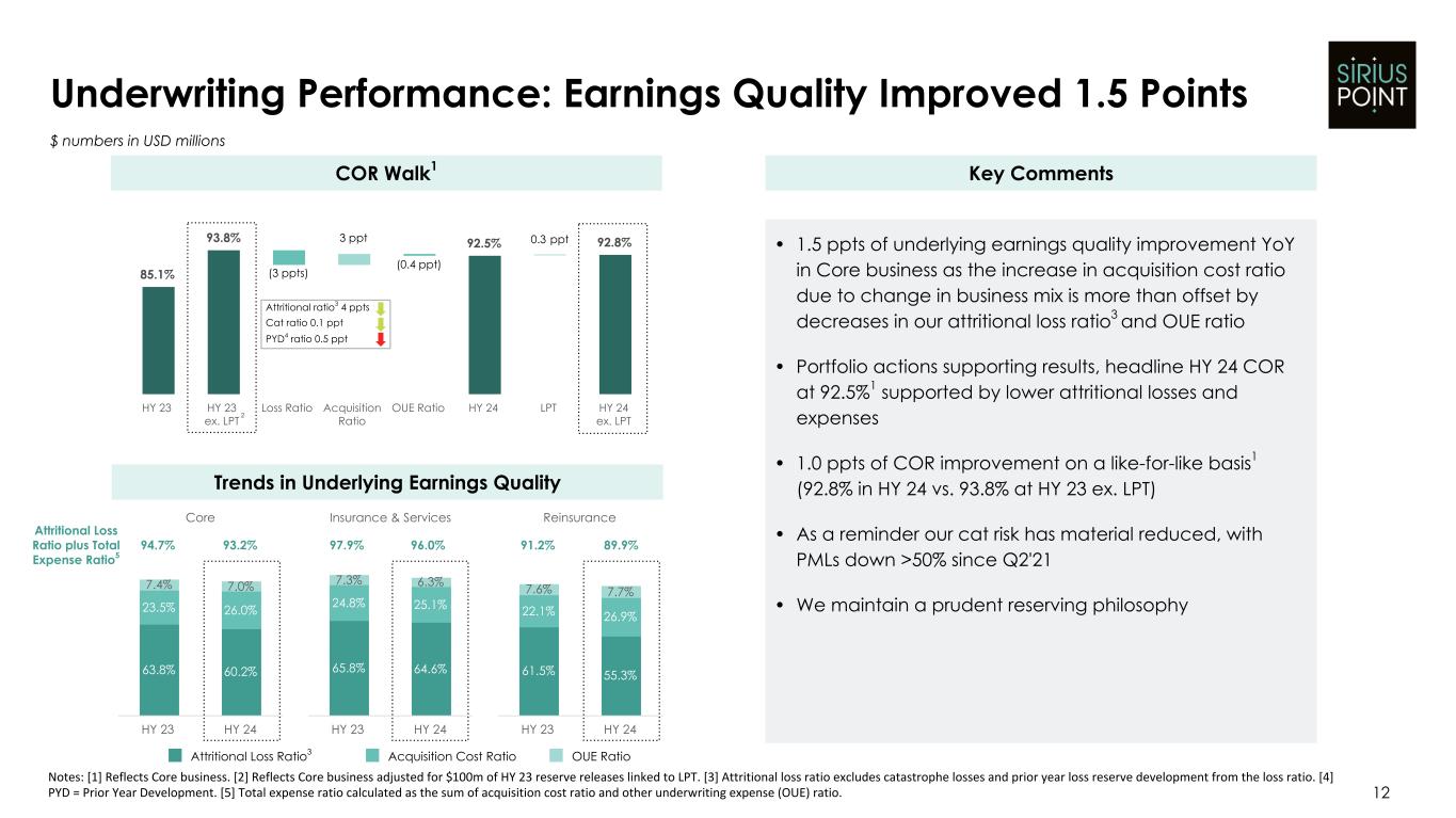 $ numbers in USD millions HY 23 HY 24 GPW1 $1,865 $1,723 NPW1 $1,352 $1,277 UW Income1 $171 $81 Net Services Fee Income1 $28 $30 Total Investment Result3 $140 $103 Net Income (Loss)4 $188 $201 COR1 (%) 85.1% 92.5% AY COR1 (%) 95.3% 93.6% FY 23 HY 24 Common Shareholders' Equity5 $2,314 $2,504 Half Year 2024 Financial Results 11 Notes: [1] Reflects Core business. [2] Adjusting Core business for Cyber and Workers' Compensation premiums exited during 2023. [3] Total investment result calculated as the sum of net realized and unrealized investment gains (losses), net realized and unrealized investment gains from related party investment funds and net investment income. [4] Net income (loss) available to SiriusPoint common shareholders. [5] Common shareholders’ equity attributable to SiriusPoint common shareholders at end of period. [6] Total expense ratio calculated as the sum of acquisition cost ratio and other underwriting expense (OUE) ratio. [7] As detailed on slide 18. [7] MTM = Mark to Market. • Continuing lines GPW (ex. 2023 exited business2) up 6% YoY, with headline GPW1 down 8% YoY • Net income4 of $201m, supported by positive underwriting, investment result, net services fee income and MGA actions7 • Core underwriting result (ex. LPT) improved by $8m, benefiting from lower attritional losses and expenses • Underlying earnings quality (attritional loss ratio plus total expense ratio6) improved 1.5 ppts YoY • Net services fee income1 at $30m (up 7% YoY), with the service margin improving 1 ppt to 24% • Total investment result3 at $103m vs. $140m at HY 23 • NII at $157m (vs $130m at HY 23) • Net realized and unrealized losses at $54m includes some strategic MGA actions7 in the quarter • Other notable items impacting income: • $45m gain from MGA actions7 • $36m interest expense ($14m related to LPT) • $5m gain from MTM8 on liability-classified capital instruments • Common shareholders' equity5 at $2.5bn, up 8% since FY 23 Key Comments ex. LPT $71 ex. LPT $94 ex. LPT 93.8% ex. LPT $78 ex. LPT $207 ex. LPT 92.8%