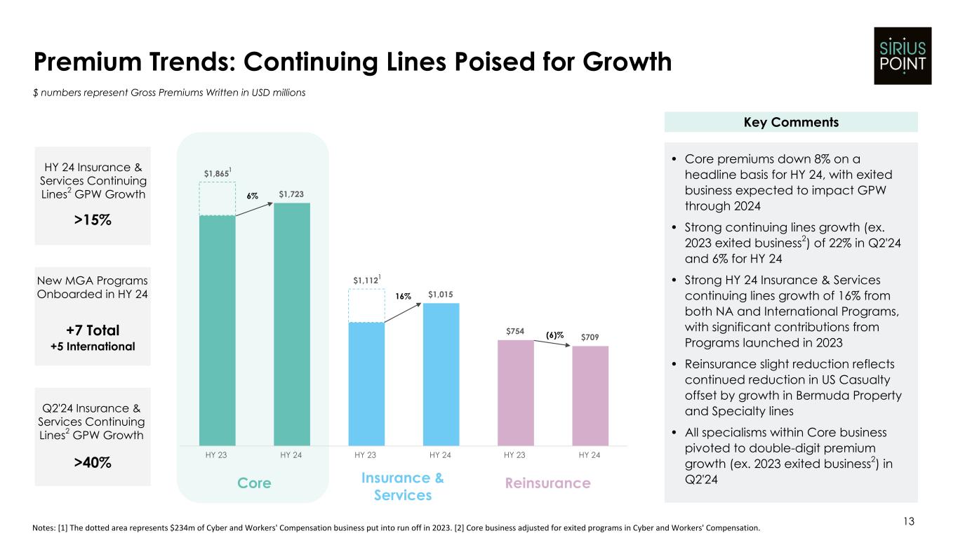 85.1% 93.8% 92.5% 92.8% HY 23 HY 23 ex. LPT Loss Ratio Acquisition Ratio OUE Ratio HY 24 LPT HY 24 ex. LPT Reinsurance 61.5% 55.3% 22.1% 26.9% 7.6% 7.7% HY 23 HY 24 Insurance & Services 65.8% 64.6% 24.8% 25.1% 7.3% 6.3% HY 23 HY 24 Attritional ratio3 4 ppts Cat ratio 0.1 ppt PYD4 ratio 0.5 ppt Underwriting Performance: Earnings Quality Improved 1.5 Points 12 COR Walk1 $ numbers in USD millions Trends in Underlying Earnings Quality Attritional Loss Ratio3 OUE Ratio Key Comments (3 ppts) 3 ppt Notes: [1] Reflects Core business. [2] Reflects Core business adjusted for $100m of HY 23 reserve releases linked to LPT. [3] Attritional loss ratio excludes catastrophe losses and prior year loss reserve development from the loss ratio. [4] PYD = Prior Year Development. [5] Total expense ratio calculated as the sum of acquisition cost ratio and other underwriting expense (OUE) ratio. (0.4 ppt) Core 63.8% 60.2% 23.5% 26.0% 7.4% 7.0% HY 23 HY 24 • 1.5 ppts of underlying earnings quality improvement YoY in Core business as the increase in acquisition cost ratio due to change in business mix is more than offset by decreases in our attritional loss ratio3 and OUE ratio • Portfolio actions supporting results, headline HY 24 COR at 92.5%1 supported by lower attritional losses and expenses • 1.0 ppts of COR improvement on a like-for-like basis1 (92.8% in HY 24 vs. 93.8% at HY 23 ex. LPT) • As a reminder our cat risk has material reduced, with PMLs down >50% since Q2'21 • We maintain a prudent reserving philosophy 2 94.7% 93.2% 97.9% 96.0% 91.2% 89.9% Attritional Loss Ratio plus Total Expense Ratio5 0.3 ppt Acquisition Cost Ratio