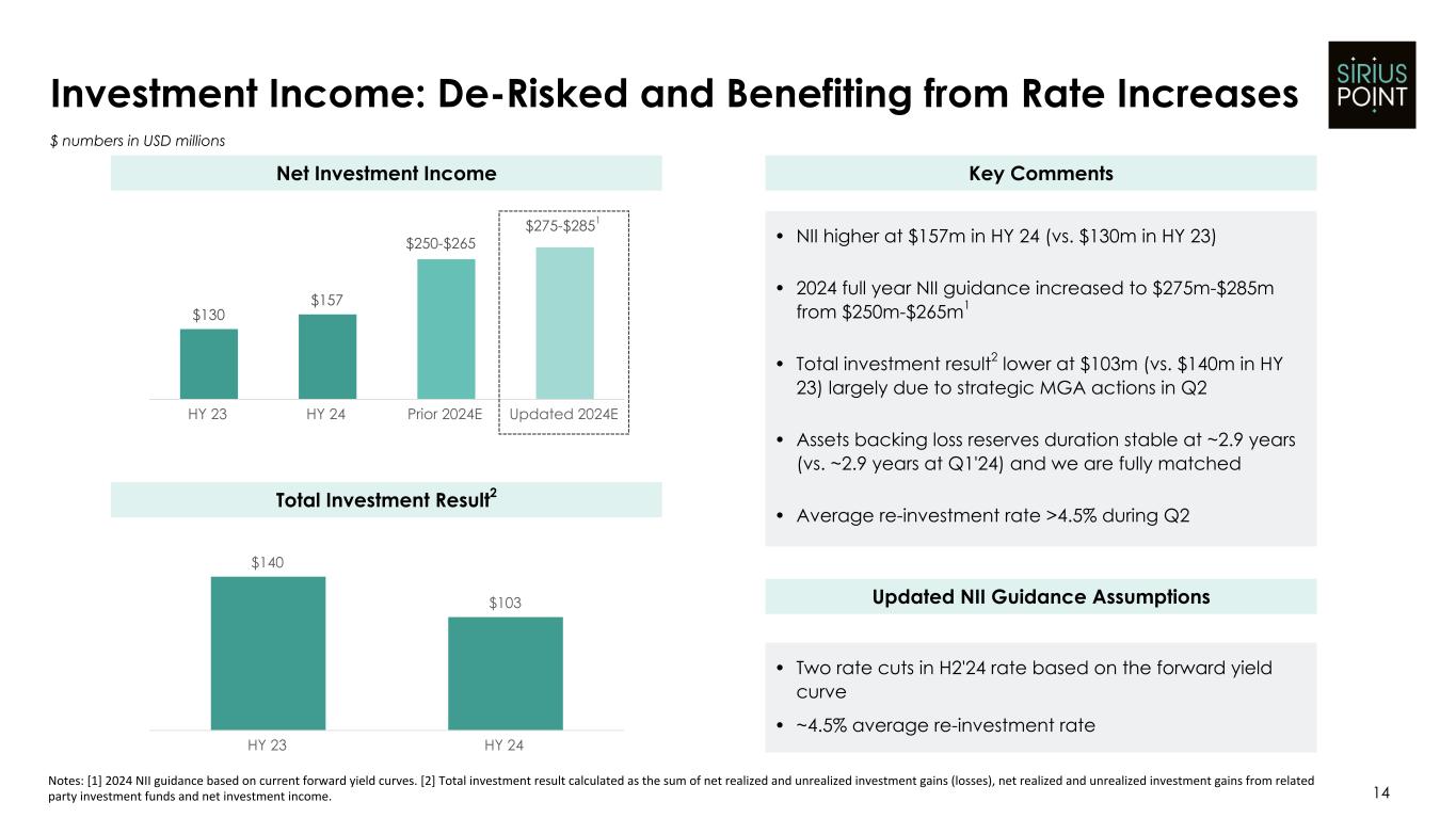 HY 24 Insurance & Services Continuing Lines2 GPW Growth $ numbers represent Gross Premiums Written in USD millions Key Comments • Core premiums down 8% on a headline basis for HY 24, with exited business expected to impact GPW through 2024 • Strong continuing lines growth (ex. 2023 exited business2) of 22% in Q2'24 and 6% for HY 24 • Strong HY 24 Insurance & Services continuing lines growth of 16% from both NA and International Programs, with significant contributions from Programs launched in 2023 • Reinsurance slight reduction reflects continued reduction in US Casualty offset by growth in Bermuda Property and Specialty lines • All specialisms within Core business pivoted to double-digit premium growth (ex. 2023 exited business2) in Q2'24 $1,865 $1,723 $1,112 $1,015 $754 $709 HY 23 HY 24 HY 23 HY 24 HY 23 HY 24 Core Insurance & Services Reinsurance 13 Premium Trends: Continuing Lines Poised for Growth Notes: [1] The dotted area represents $234m of Cyber and Workers' Compensation business put into run off in 2023. [2] Core business adjusted for exited programs in Cyber and Workers' Compensation. 16% (6)% 6% >15% New MGA Programs Onboarded in HY 24 +7 Total +5 International Q2'24 Insurance & Services Continuing Lines2 GPW Growth >40% 1 1