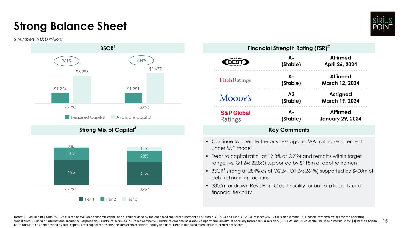 $140 $103 HY 23 HY 24 $130 $157 HY 23 HY 24 Prior 2024E Updated 2024E Investment Income: De-Risked and Benefiting from Rate Increases 14 $ numbers in USD millions Key Comments Notes: [1] 2024 NII guidance based on current forward yield curves. [2] Total investment result calculated as the sum of net realized and unrealized investment gains (losses), net realized and unrealized investment gains from related party investment funds and net investment income. $275-$2851 Net Investment Income Total Investment Result2 • NII higher at $157m in HY 24 (vs. $130m in HY 23) • 2024 full year NII guidance increased to $275m-$285m from $250m-$265m1 • Total investment result2 lower at $103m (vs. $140m in HY 23) largely due to strategic MGA actions in Q2 • Assets backing loss reserves duration stable at ~2.9 years (vs. ~2.9 years at Q1'24) and we are fully matched • Average re-investment rate >4.5% during Q2 $250-$265 Updated NII Guidance Assumptions • Two rate cuts in H2'24 rate based on the forward yield curve • ~4.5% average re-investment rate