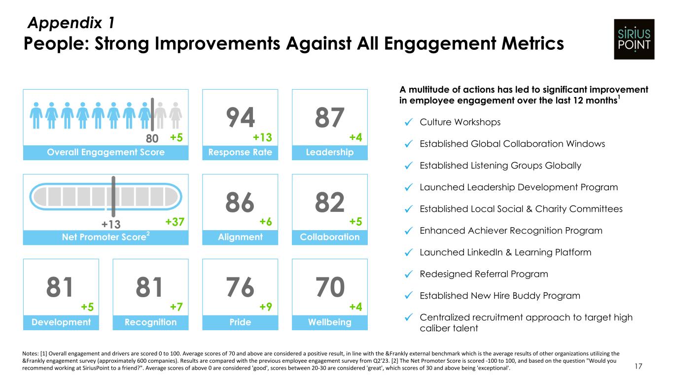 People: Strong Improvements Against All Engagement Metrics Overall Engagement Score Recognition Response Rate Development 81 81 94 Alignment 86 Wellbeing 70 Leadership 87 Collaboration 82 Net Promoter Score2 Pride 76 +4 +5 +4 +9 +7 +5 +6 +13 +37 +5 +13 80 A multitude of actions has led to significant improvement in employee engagement over the last 12 months1 Culture Workshops Established Global Collaboration Windows Established Listening Groups Globally Launched Leadership Development Program Established Local Social & Charity Committees Enhanced Achiever Recognition Program Launched LinkedIn & Learning Platform Redesigned Referral Program Established New Hire Buddy Program Centralized recruitment approach to target high caliber talent Notes: [1] Overall engagement and drivers are scored 0 to 100. Average scores of 70 and above are considered a positive result, in line with the &Frankly external benchmark which is the average results of other organizations utilizing the &Frankly engagement survey (approximately 600 companies). Results are compared with the previous employee engagement survey from Q2'23. [2] The Net Promoter Score is scored -100 to 100, and based on the question "Would you recommend working at SiriusPoint to a friend?". Average scores of above 0 are considered 'good', scores between 20-30 are considered 'great', which scores of 30 and above being 'exceptional'. 17 Appendix 1